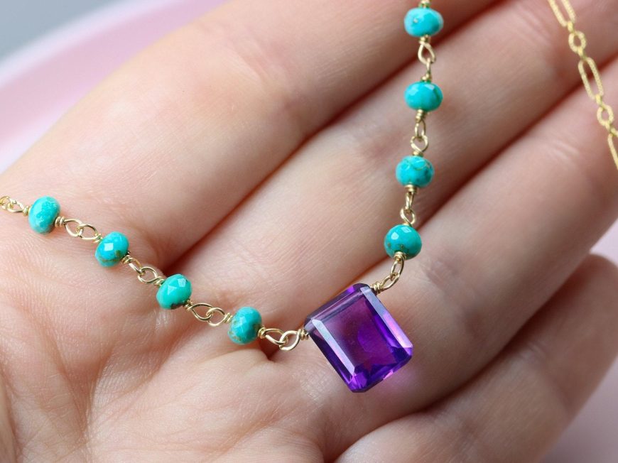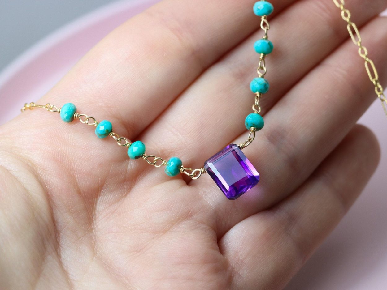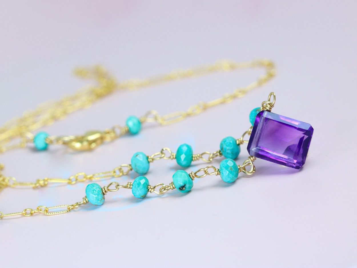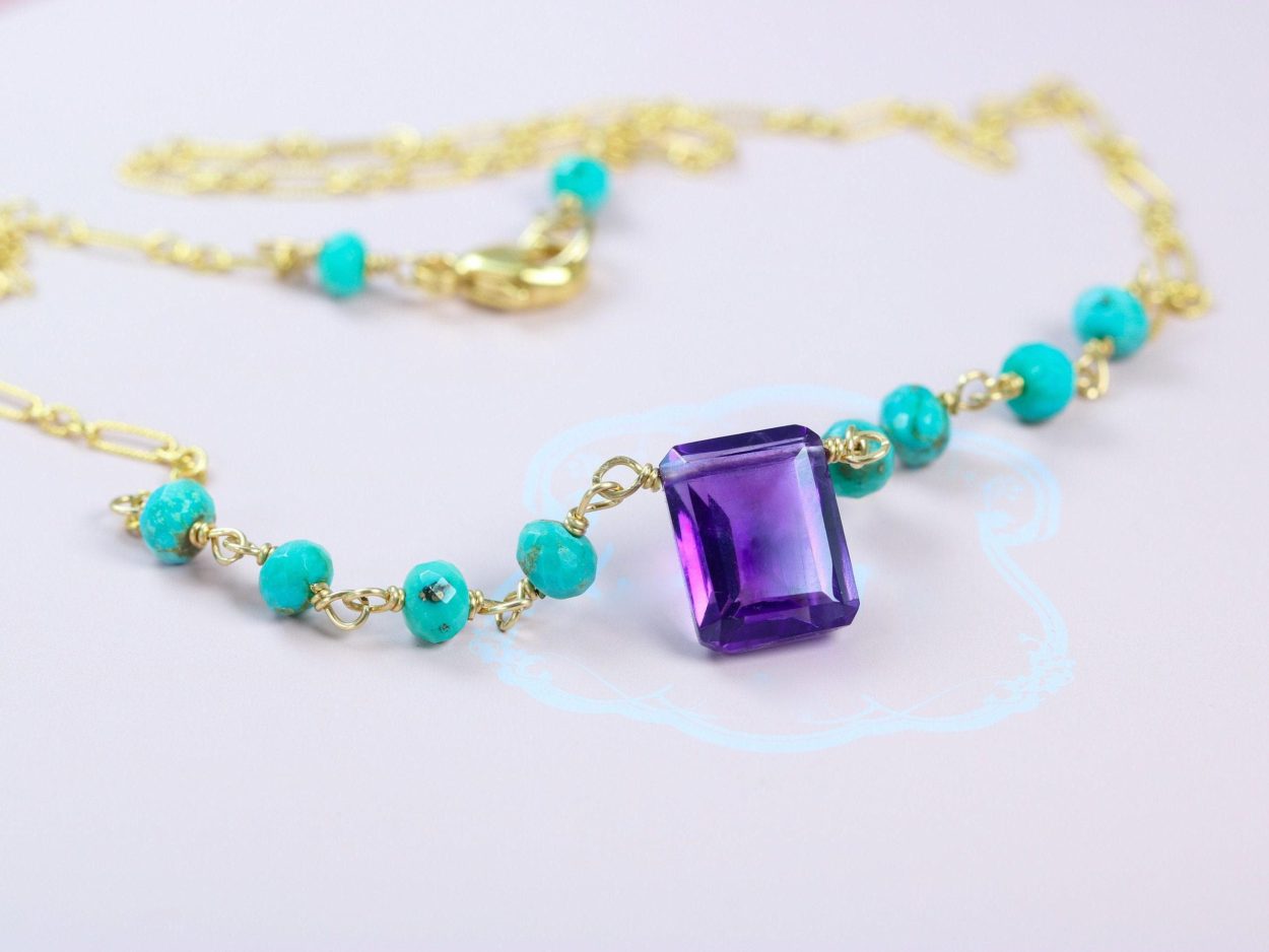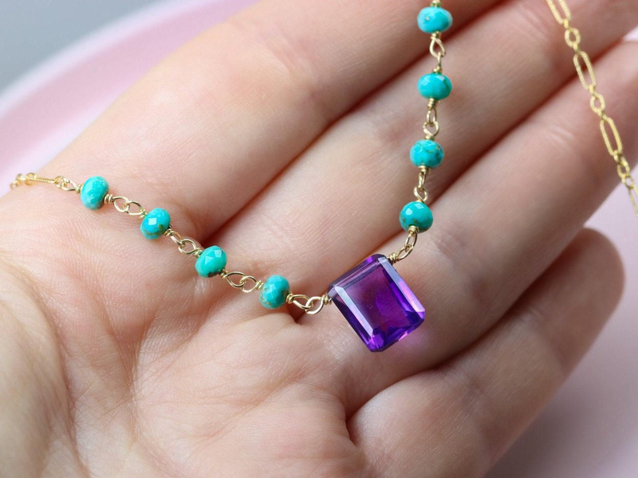 Dainty sparkling piece for a lover of high quality gemstones and unique color palettes. Here I chose a wonderful, clear Amethyst and surrounded it with vivid Sleeping Beauty Turquoise beads.