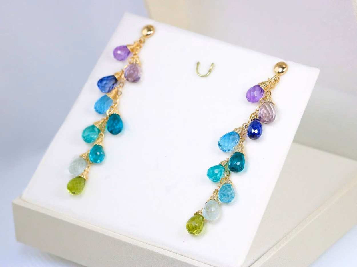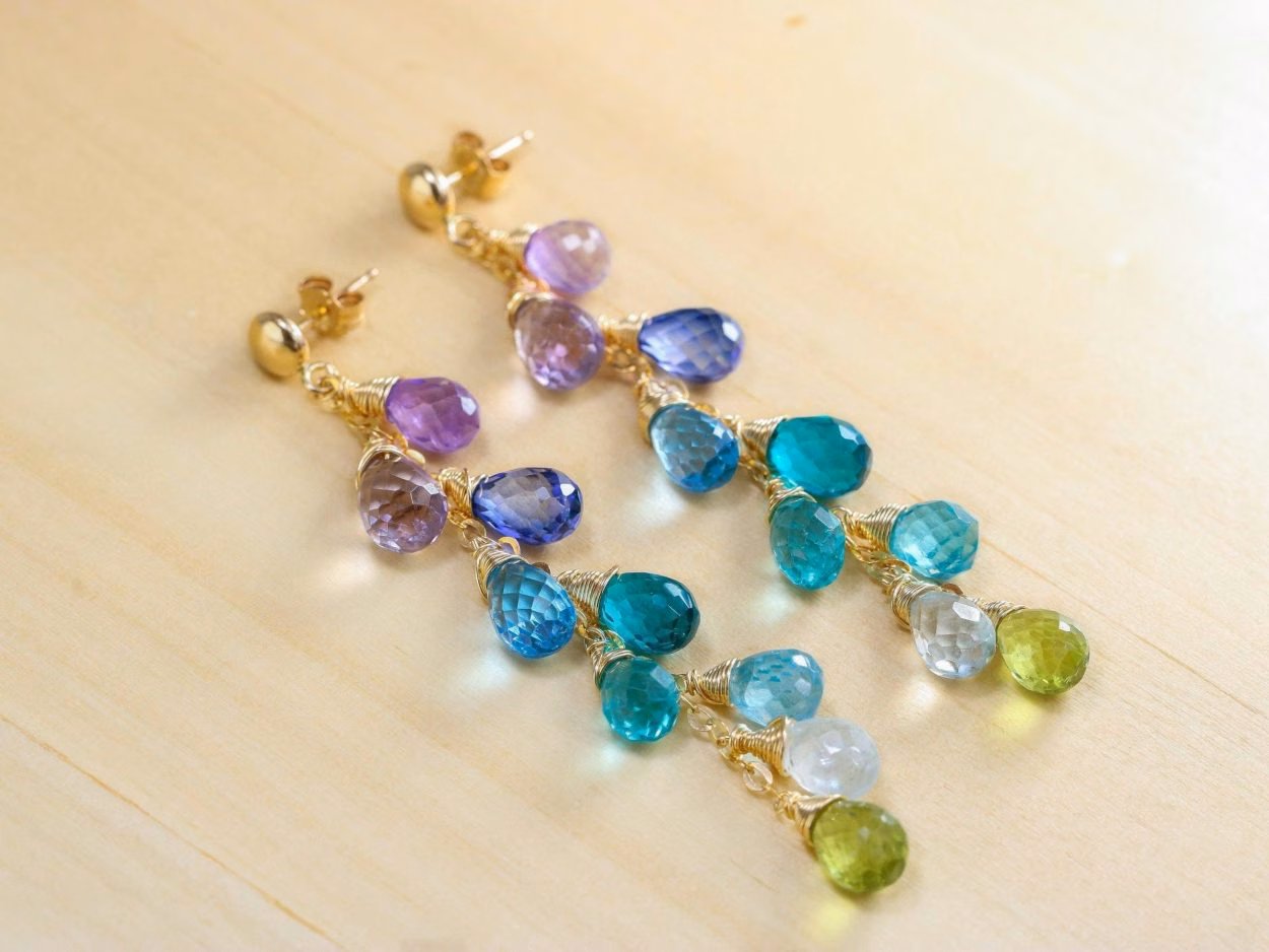 These earrings are absolutely lovely! The delicate looking briolettes of rich jewel colors are so beautiful and elegant dangling from their golden chain. Very eye catching. It is a delightful work of art and I will be back for more! Thank you.