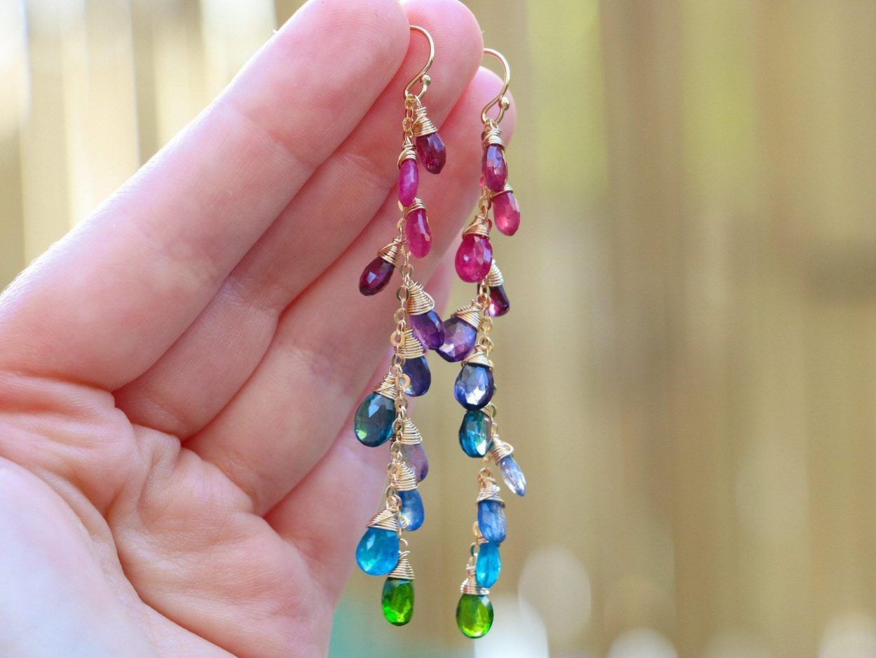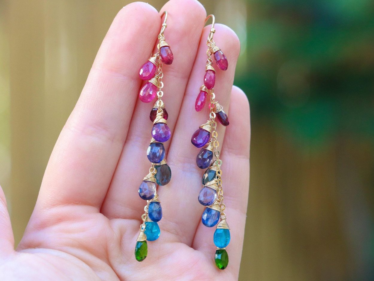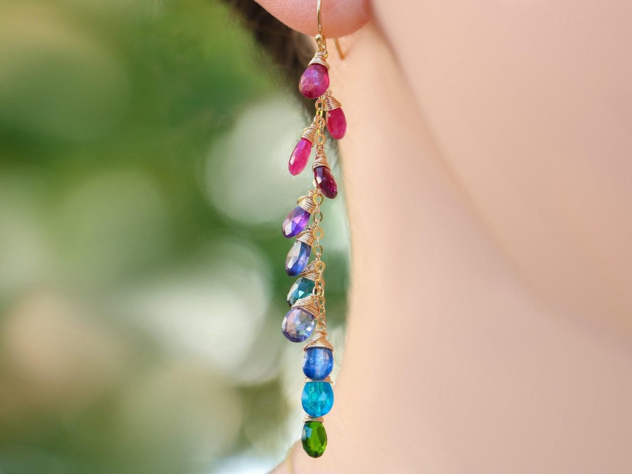 Long statement gemstone earrings full of amazing colors and perfect stones.