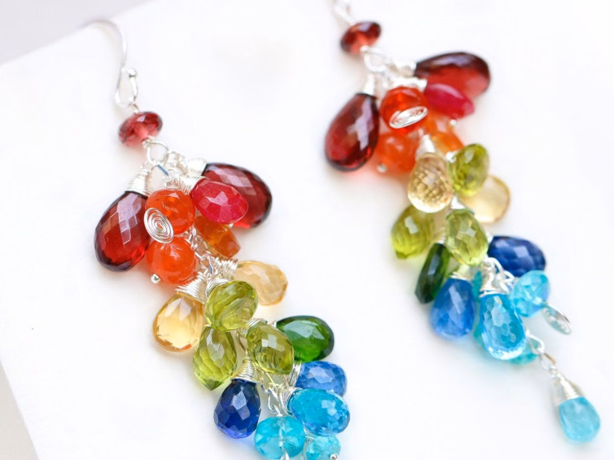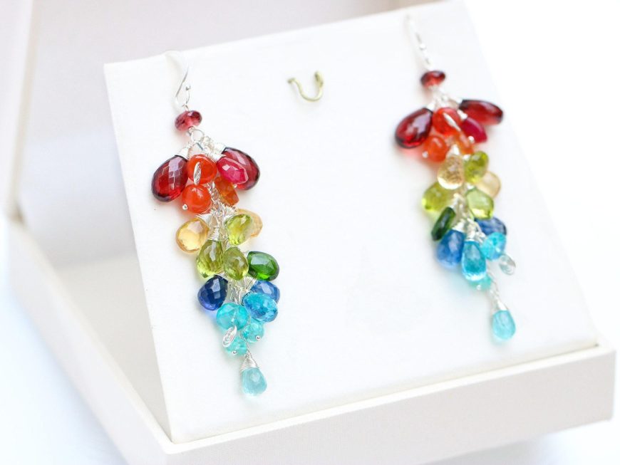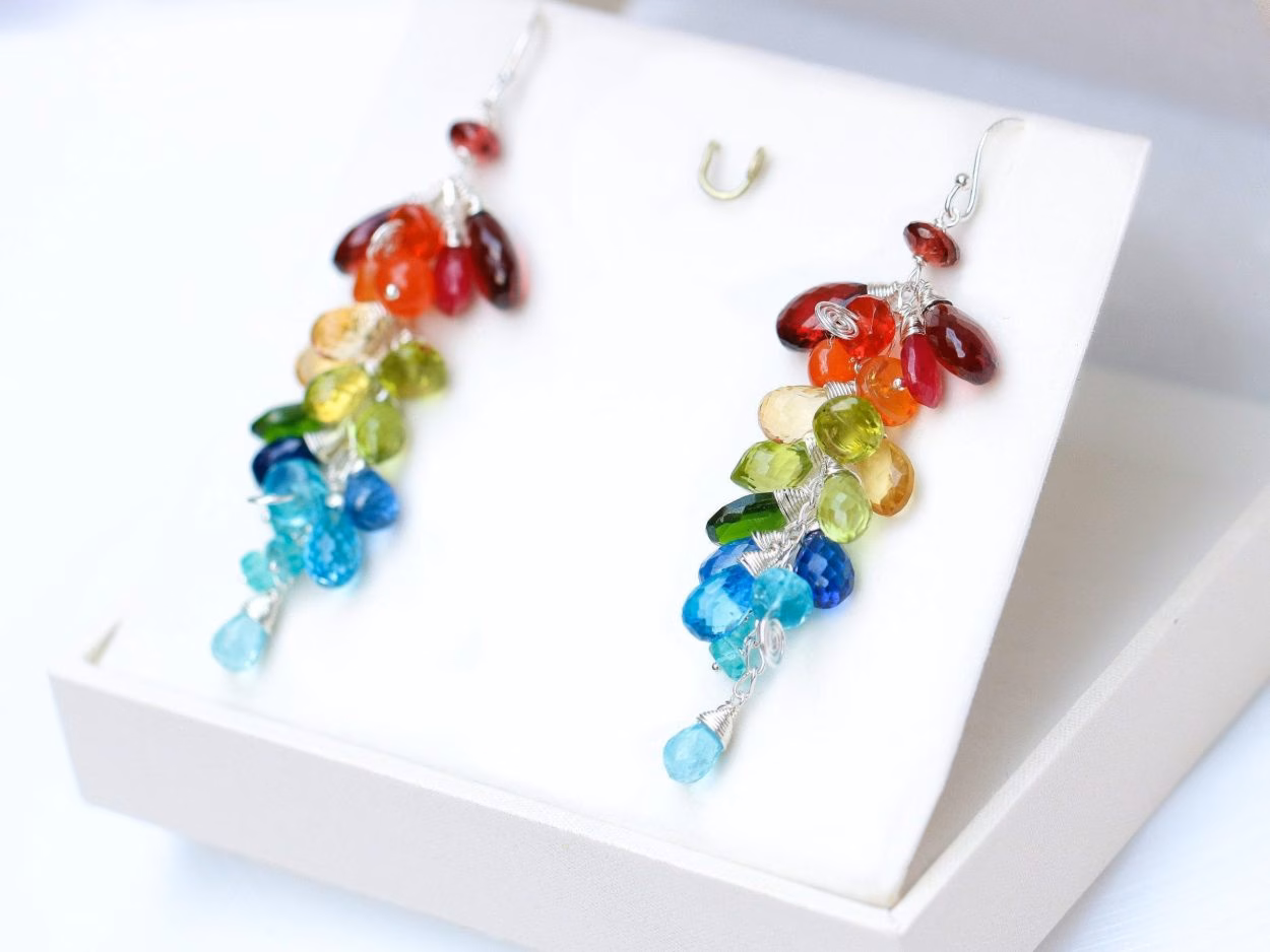 These colorful stunning gems, each hand-wrapped with sterling silver wire, swish downwards from silver chains and create long cluster cascade earrings with gradated rainbow hues from rich red to Caribbean blue.