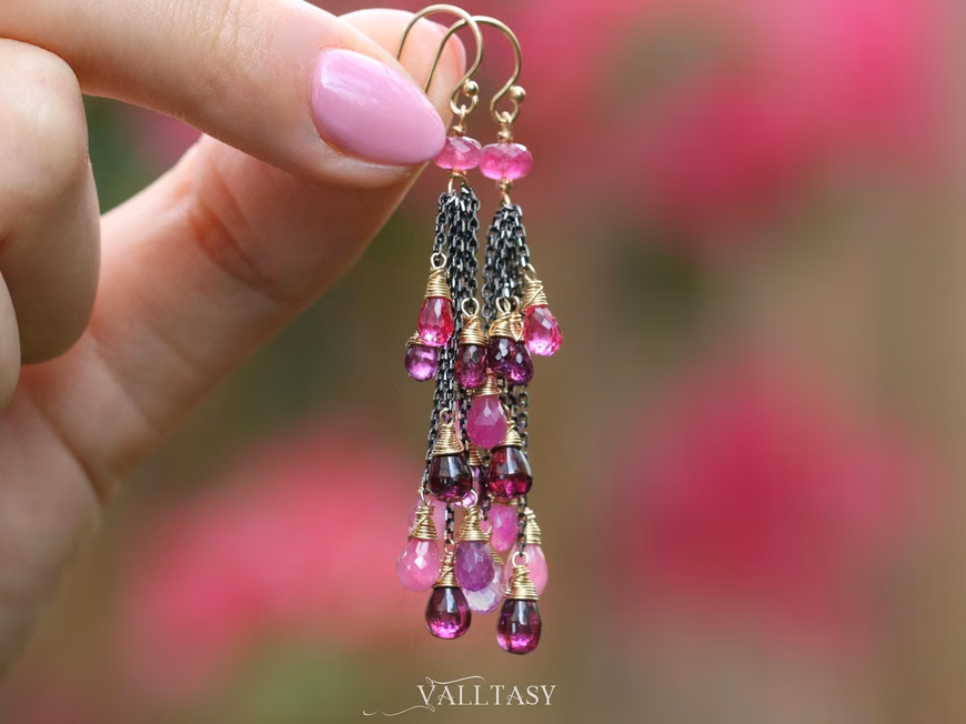 This intricate pair of earrings features breathtakingly gorgeous precious gemstone drops in pink-purple color palette. They sparkle and dangle with every move!