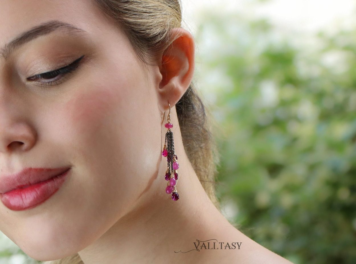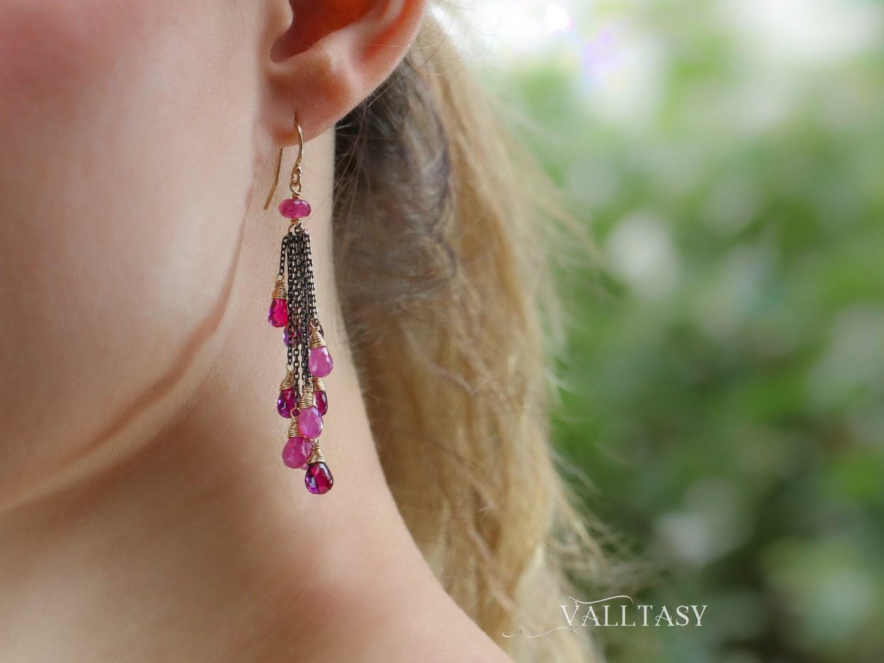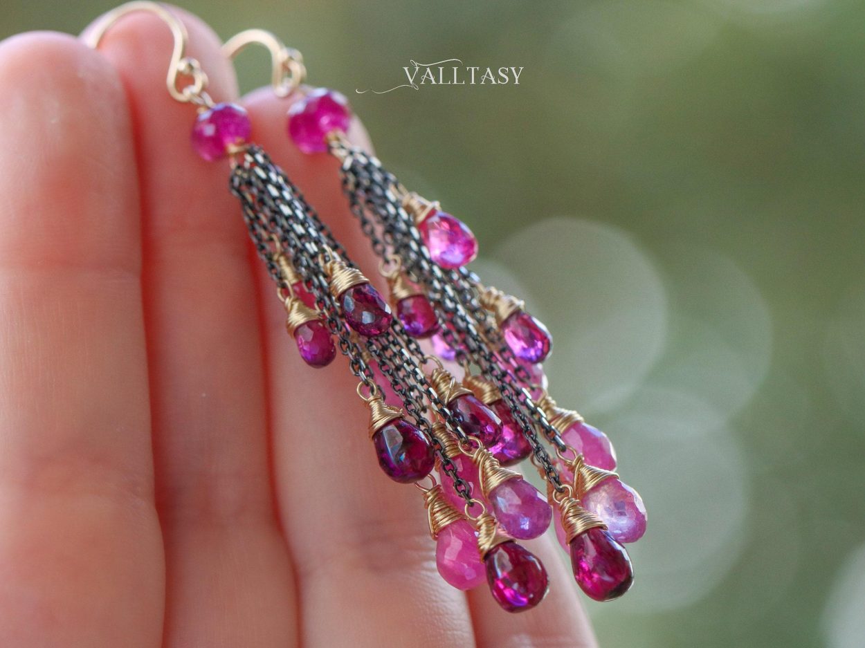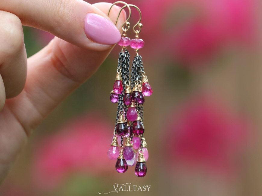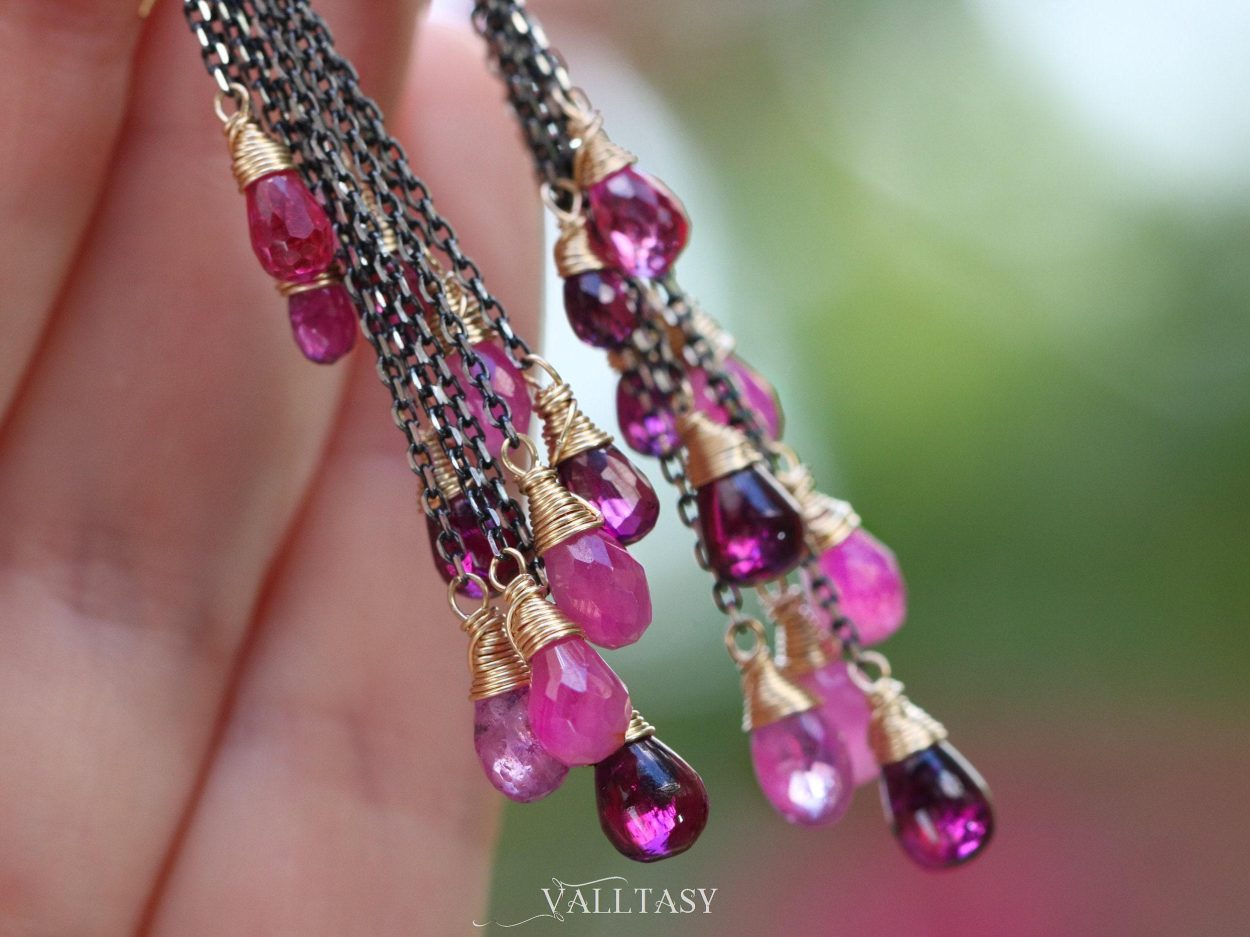 This intricate pair of earrings features breathtakingly gorgeous precious gemstone drops in pink-purple color palette. They sparkle and dangle with every move!