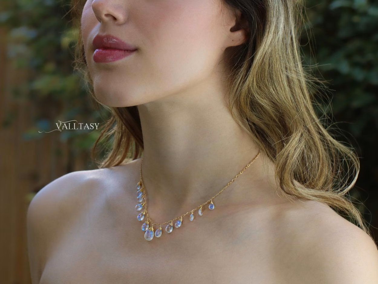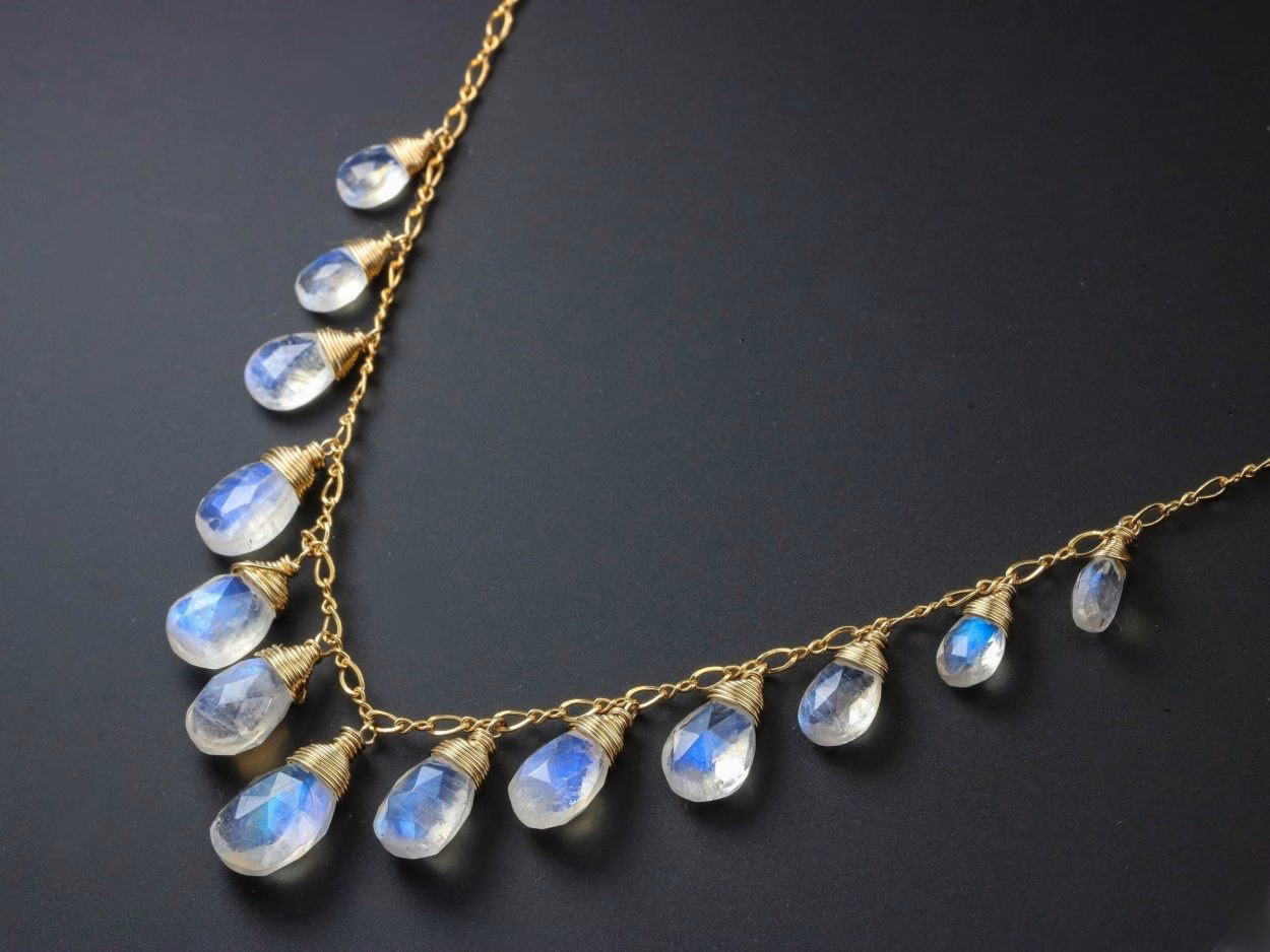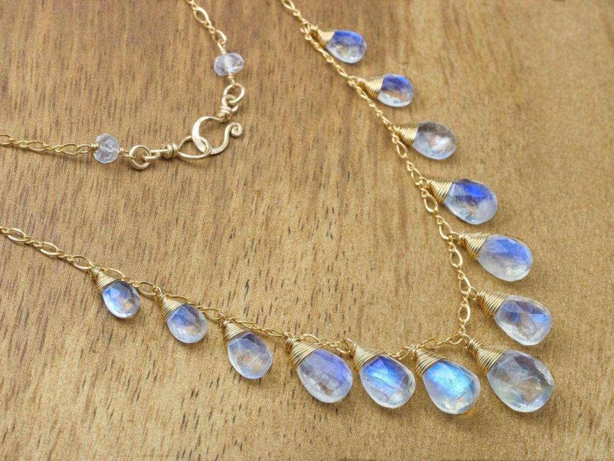 Elegant statement necklace with fantastic Rainbow Moonstone briolettes. This necklace quickly became one of my favorites, as the gemstones here… well, they’re truly amazing. Here I have wire-wrapped the best quality Moonstone drops, each one has bold blue, icy, almost transparent appearance, and fire that glows from within the gem.