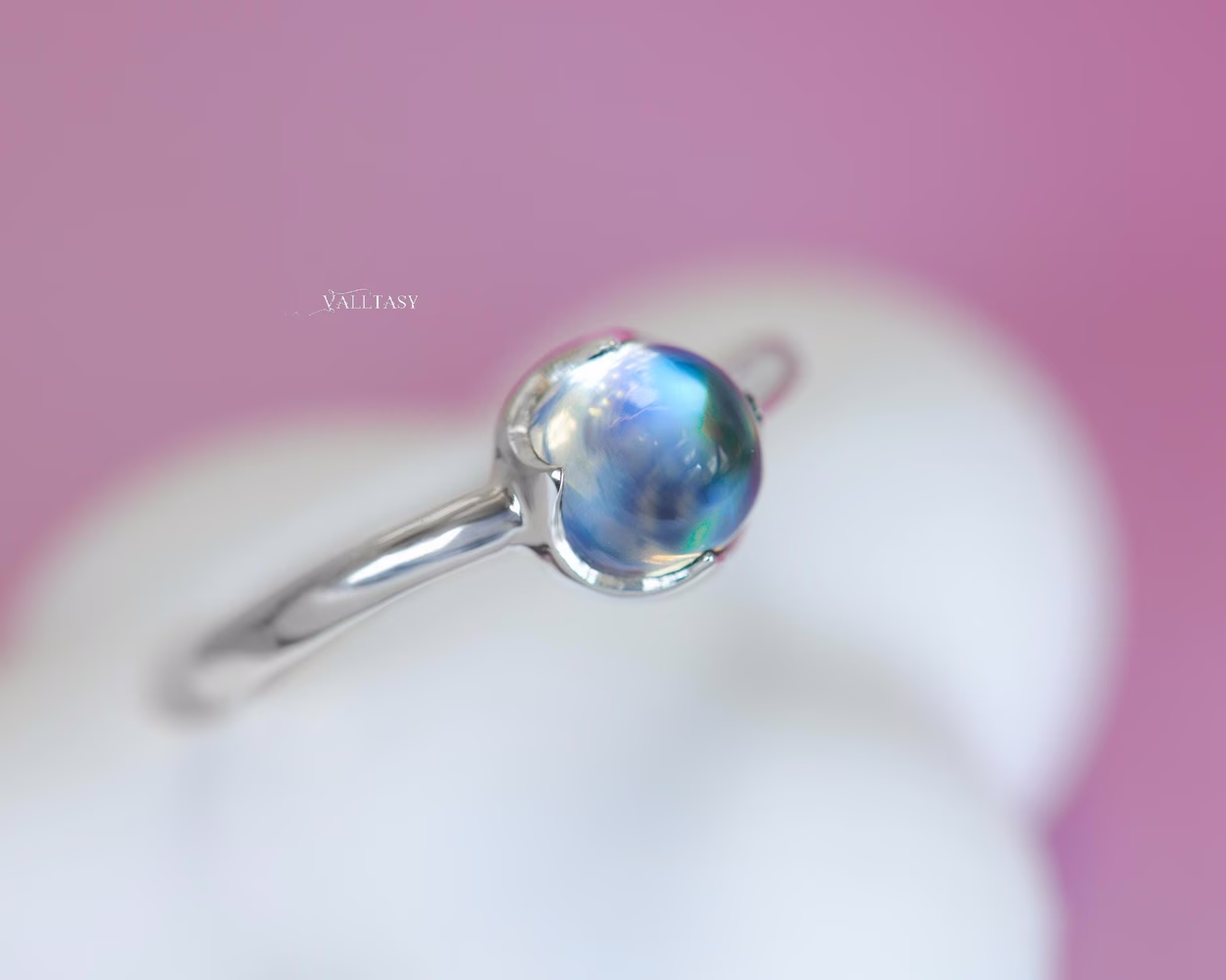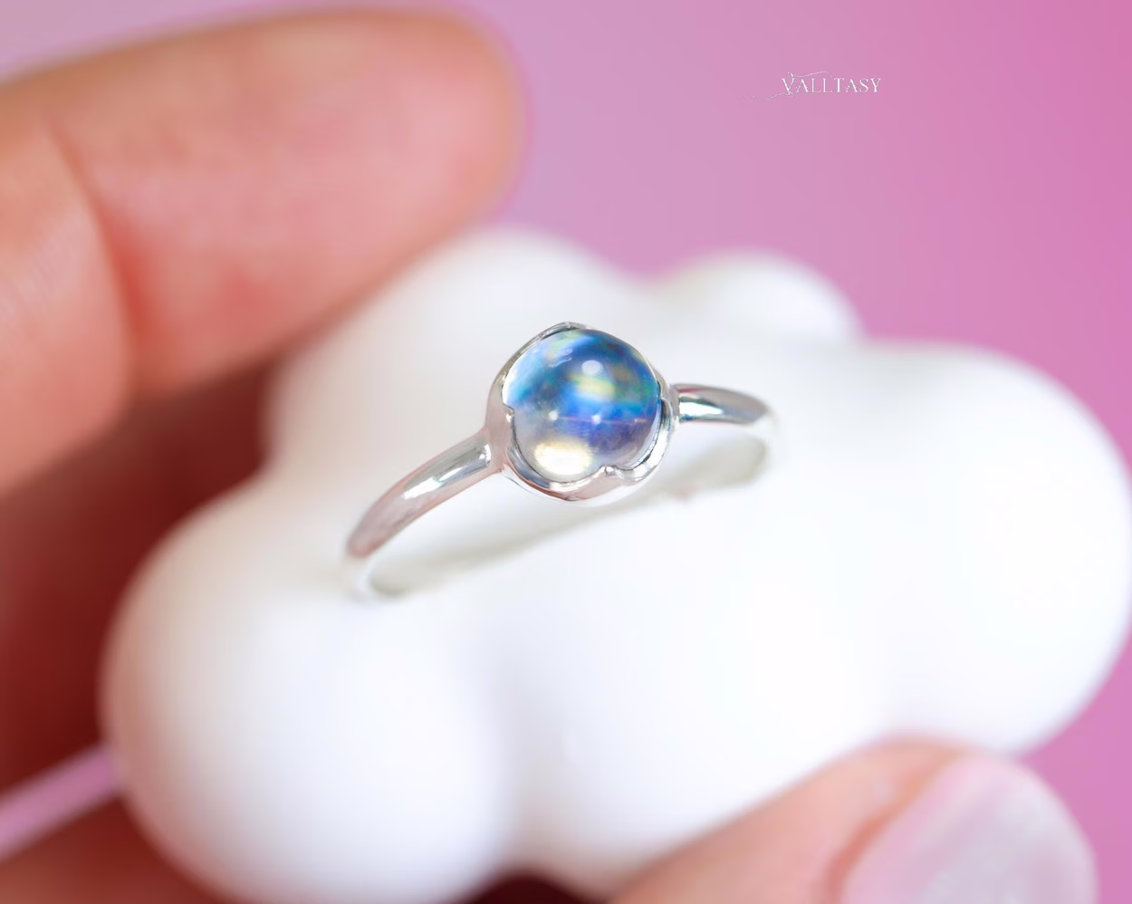 This delicate Rainbow Moonstone glows with shifting flashes of blue, like a quiet sky changing its mood with every movement of light. Sometimes soft and misty, sometimes bright and alive – always magical.