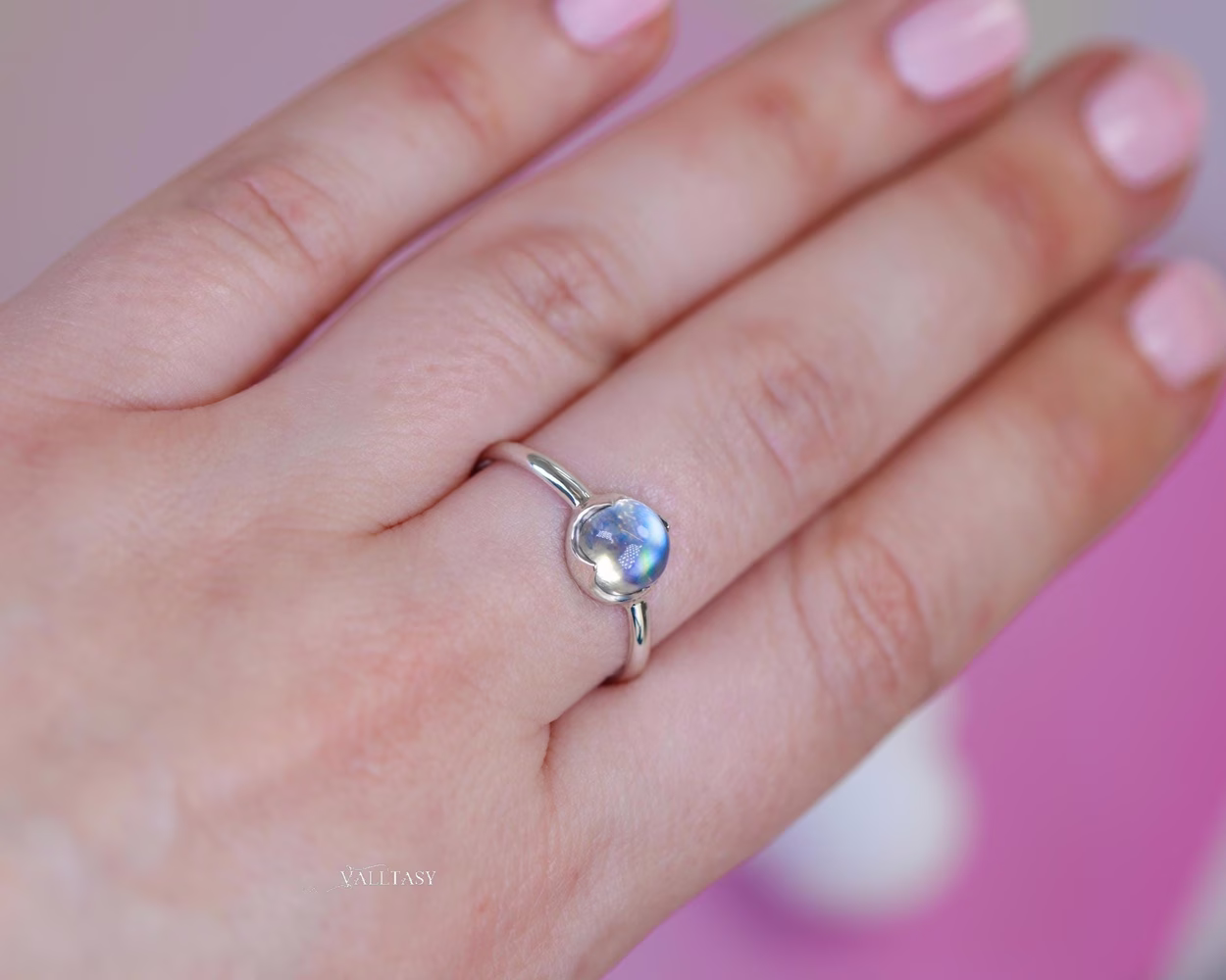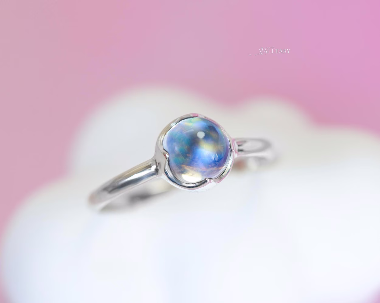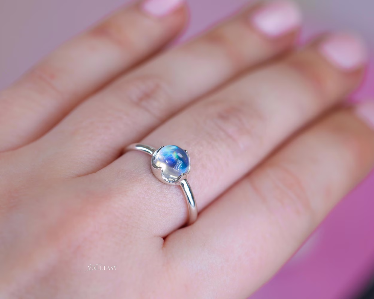 High quality Moonstone cabochon set in sterling silver – the smooth, minimal design lets the gemstone speak for itself, making it perfect for everyday wear or gentle stacking with your favorite rings.