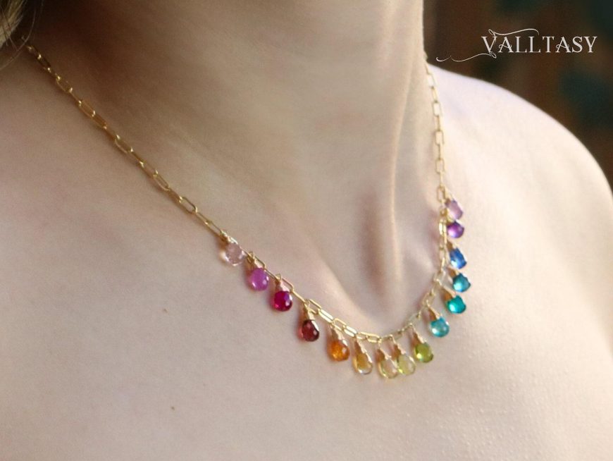This drop gemstone necklace features breathtakingly gorgeous precious stones in a rainbow palette with colors that will make you dance with joy!