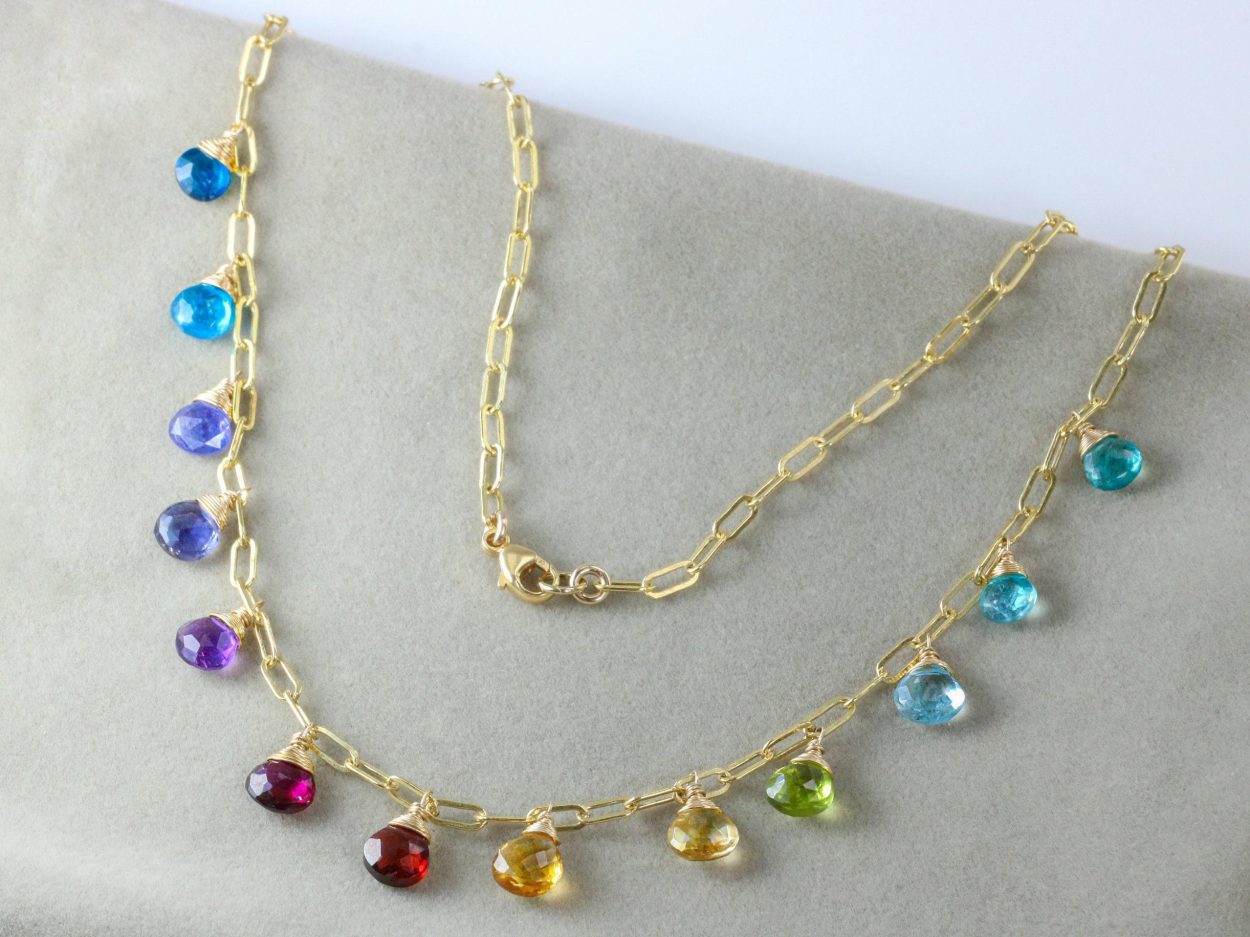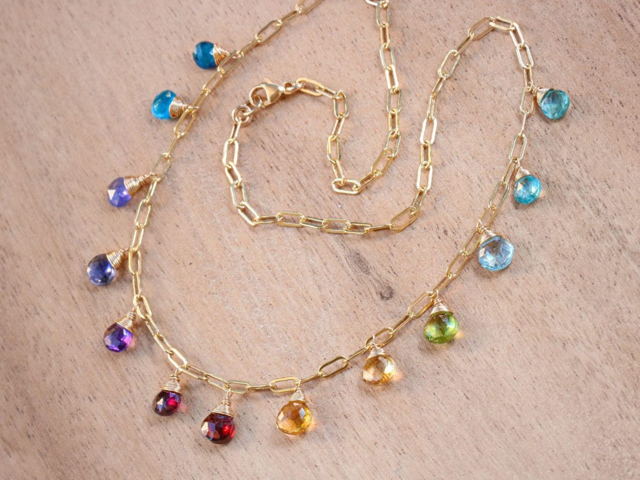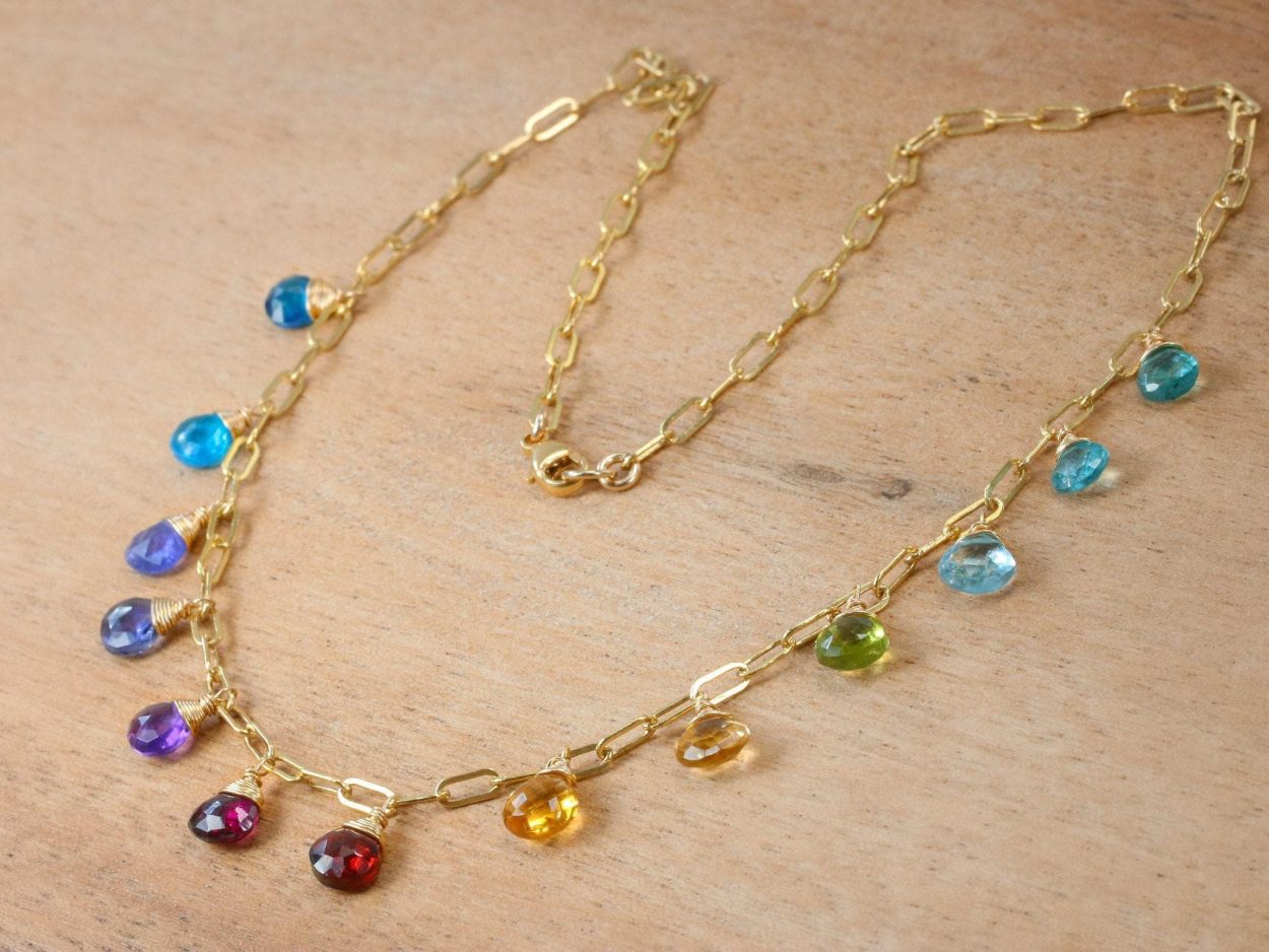 This necklace features breathtakingly gorgeous precious gemstones in a rainbow color palette that will make you dance with joy!