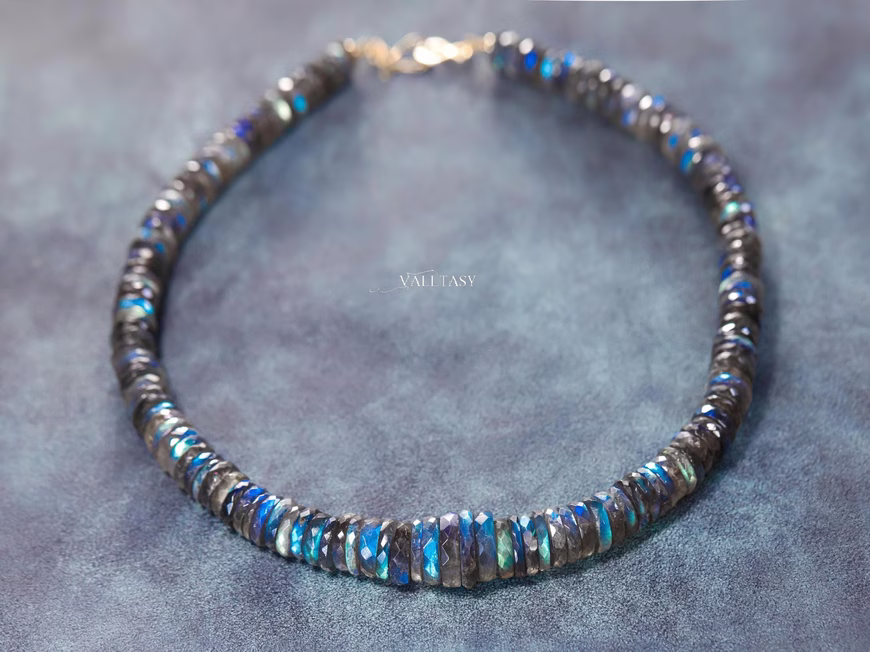This Labradorite necklace glows like the night sky under moonlight. This piece features hand-cut Blue Labradorite gems with mesmerizing flashes of electric blue, strung gracefully and finished in 14K Solid Gold. Each stone catches the light with every movement, like stars flickering across a velvet sky. Elegant, powerful, and timeless – it’s a celestial beauty to wear close to your heart.