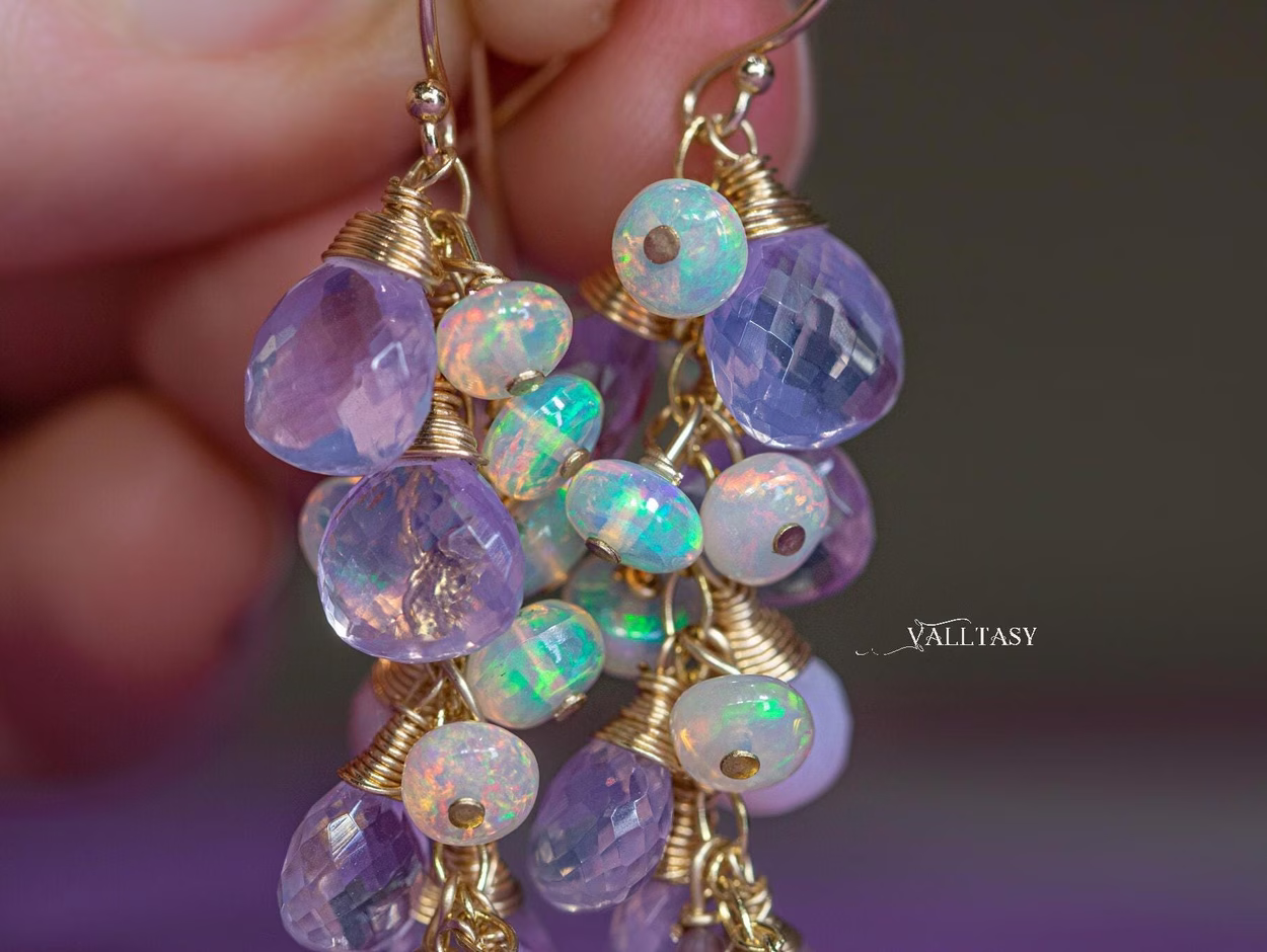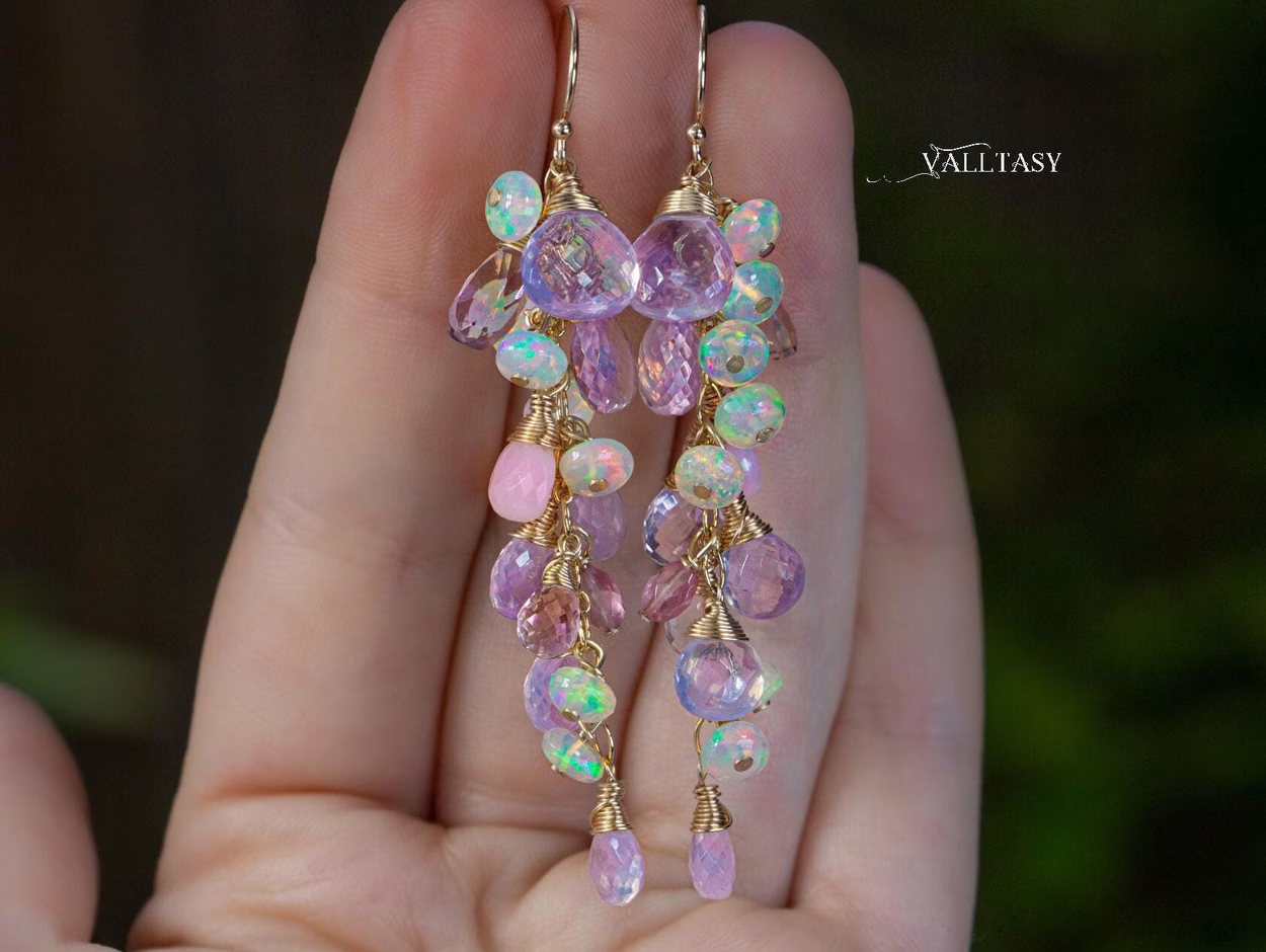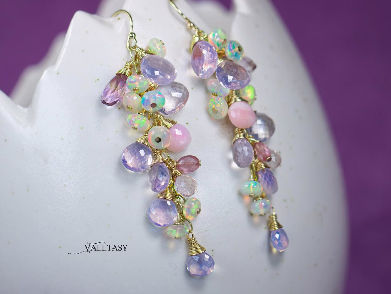 Crafted in luxurious 14K solid gold, these dramatic gemstone earrings enchant with super fiery Opals, lavender and light pink gemstones.