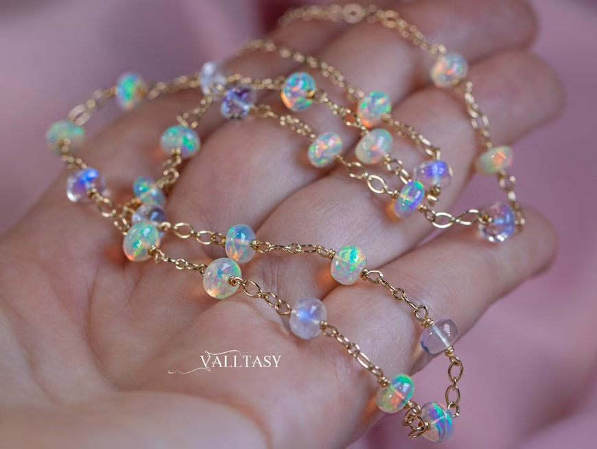 Each Opal and Moonstone is woven into the gold chain in the Rosary technique.