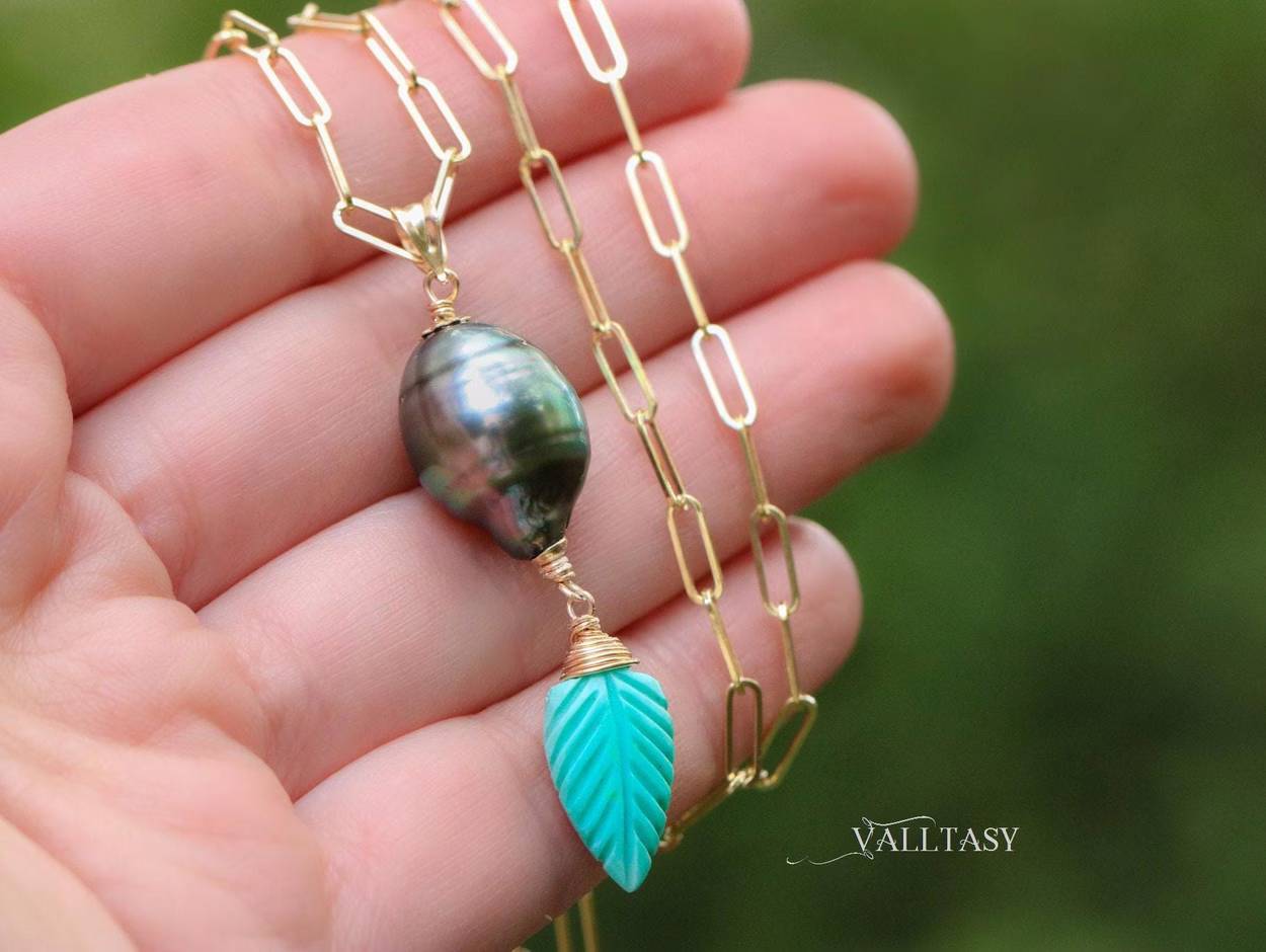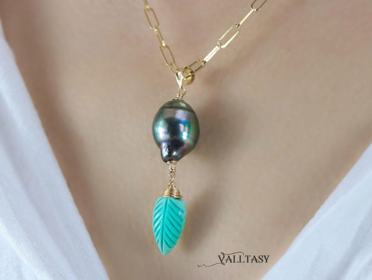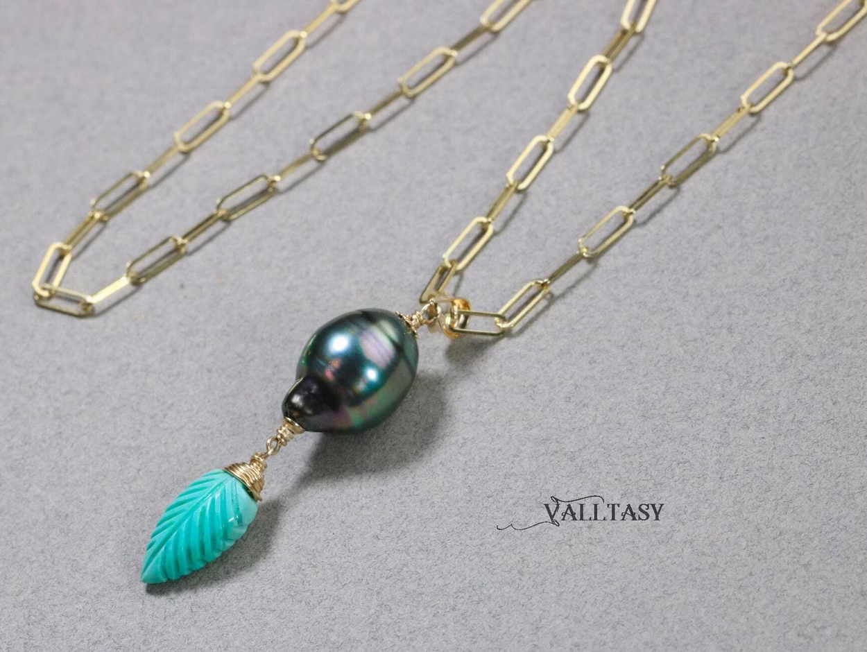 This unique Solid Gold 14K pendant is made with a fantastic metallic Tahitian Pearl and a Carved Turquoise Leaf.