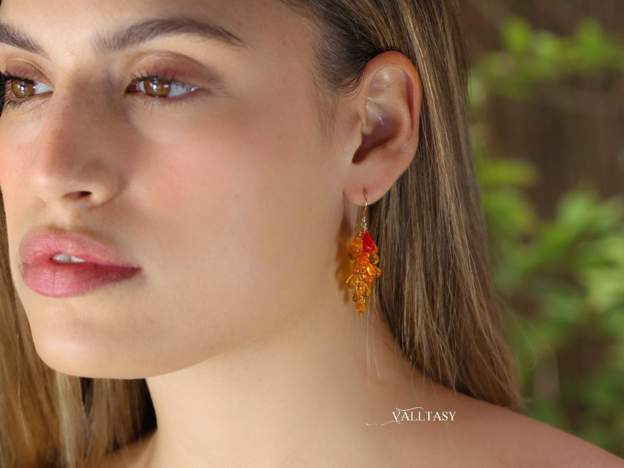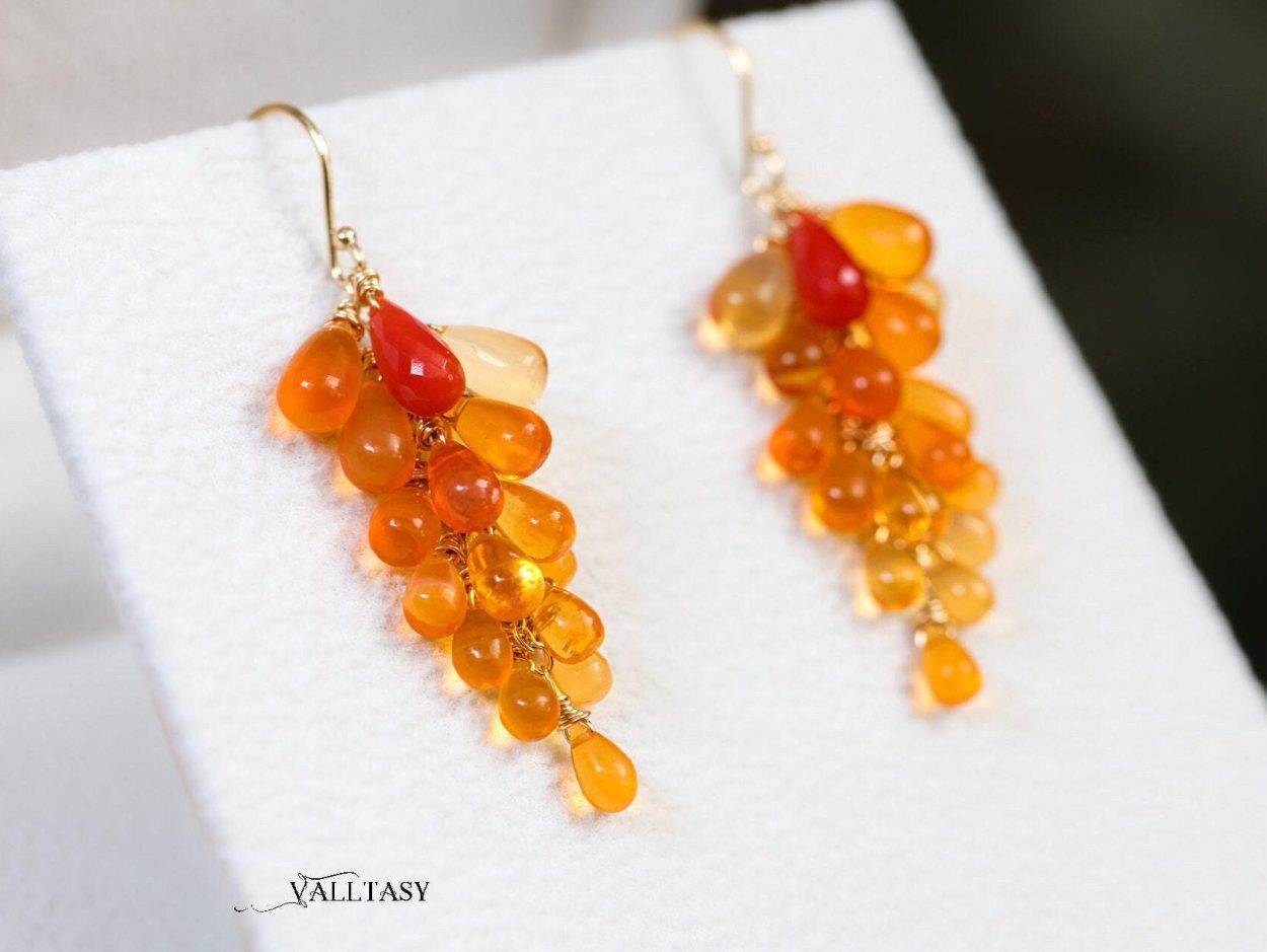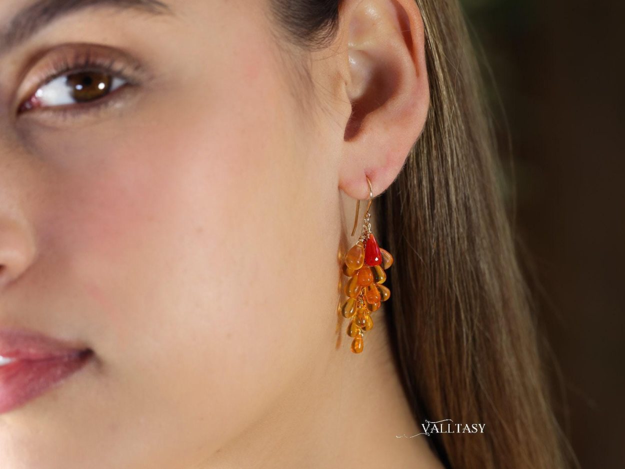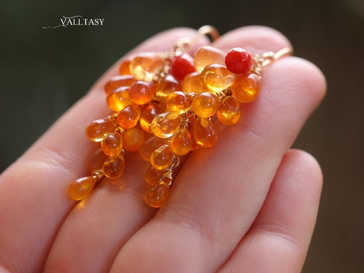 Get ready to shine with The Sun Burst Earrings! These Solid Gold 14K earrings feature stunning Mexican Fire Opals and genuine Coral gemstones in a vibrant cluster of orange.