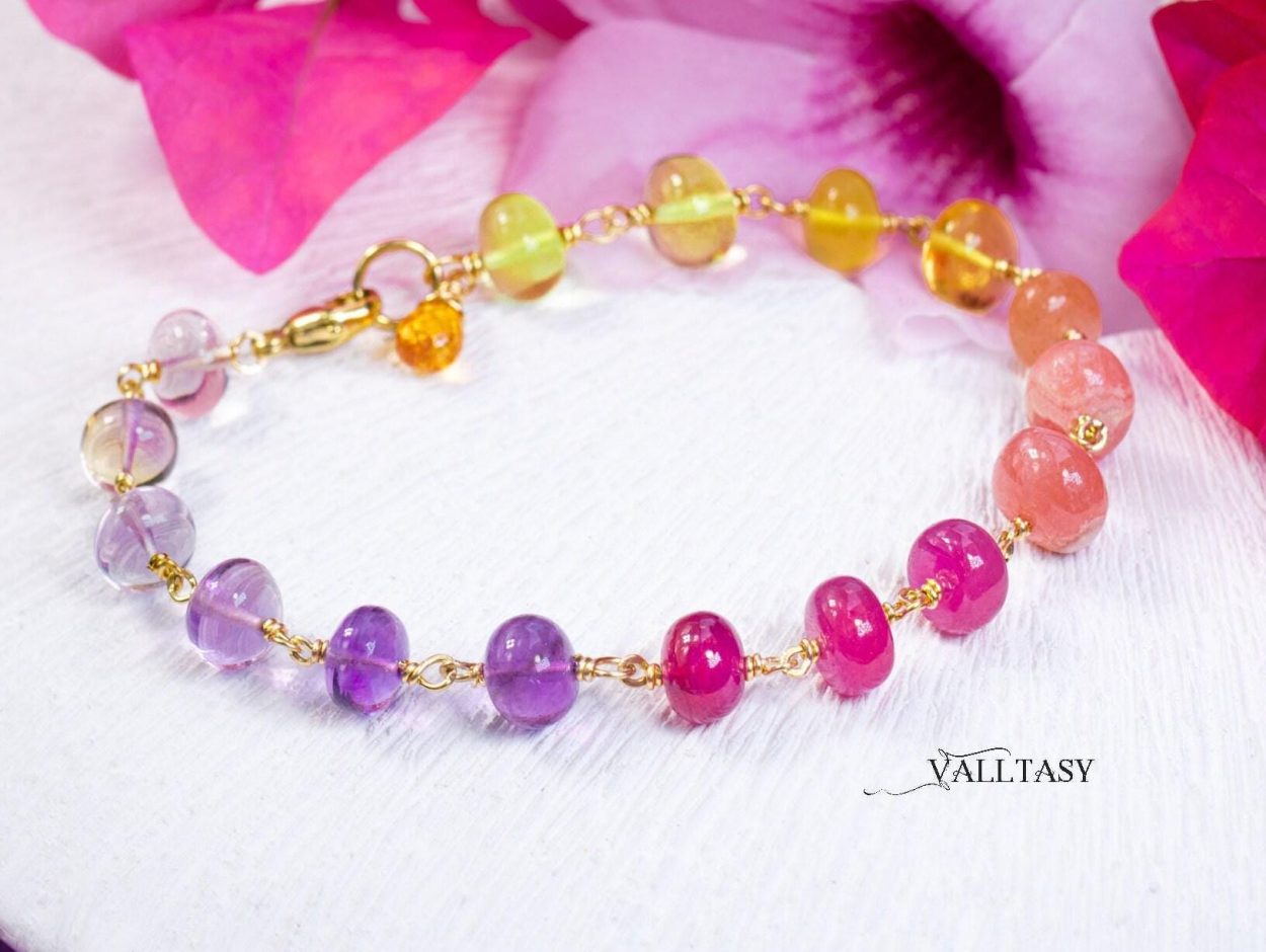 This delicious 14K Solid Gold bracelet features breathtakingly gorgeous precious gemstones in a rich color palette of of a setting sun during a summer vacation.