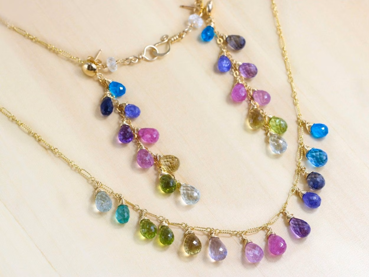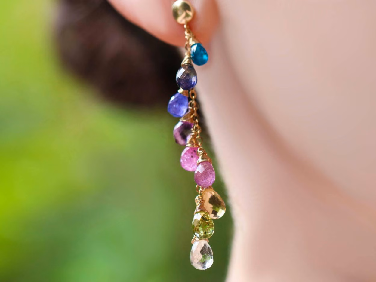 Solid Gold 14K drop earrings in the most vivid and colorful hues! Precious gemstones beautifully dangle on a chain. Here I have wire-wrapped the best quality gemstone drops in a rainbow palette of sea foam blue, green, violet and pink, purple and blues. Each drop sparkles like crazy and is very very clear!