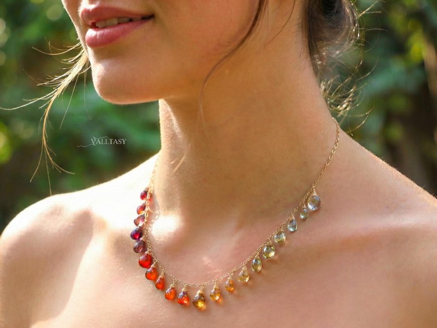 Playful multi gemstone necklace, made in 14K Solid Gold, with vivid red-orange gemstones. Like a flame, they sparkle, glow and bring lots of light.
