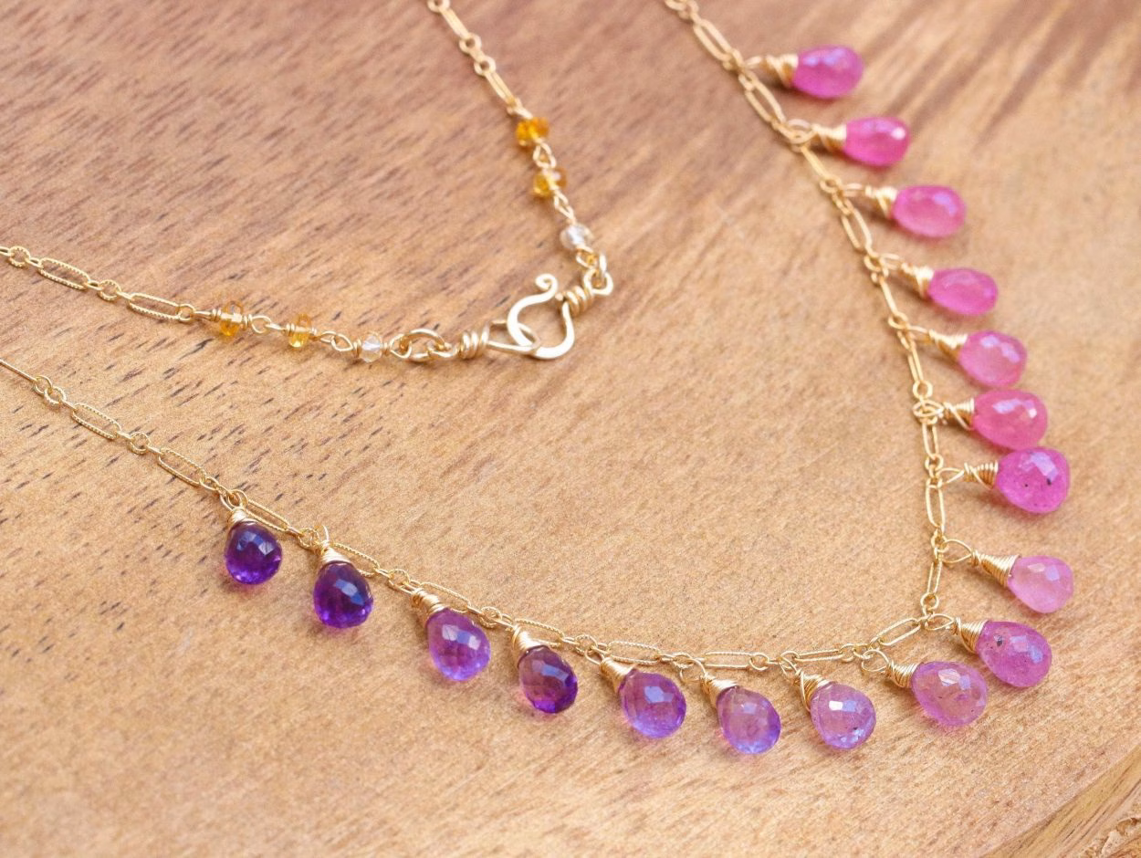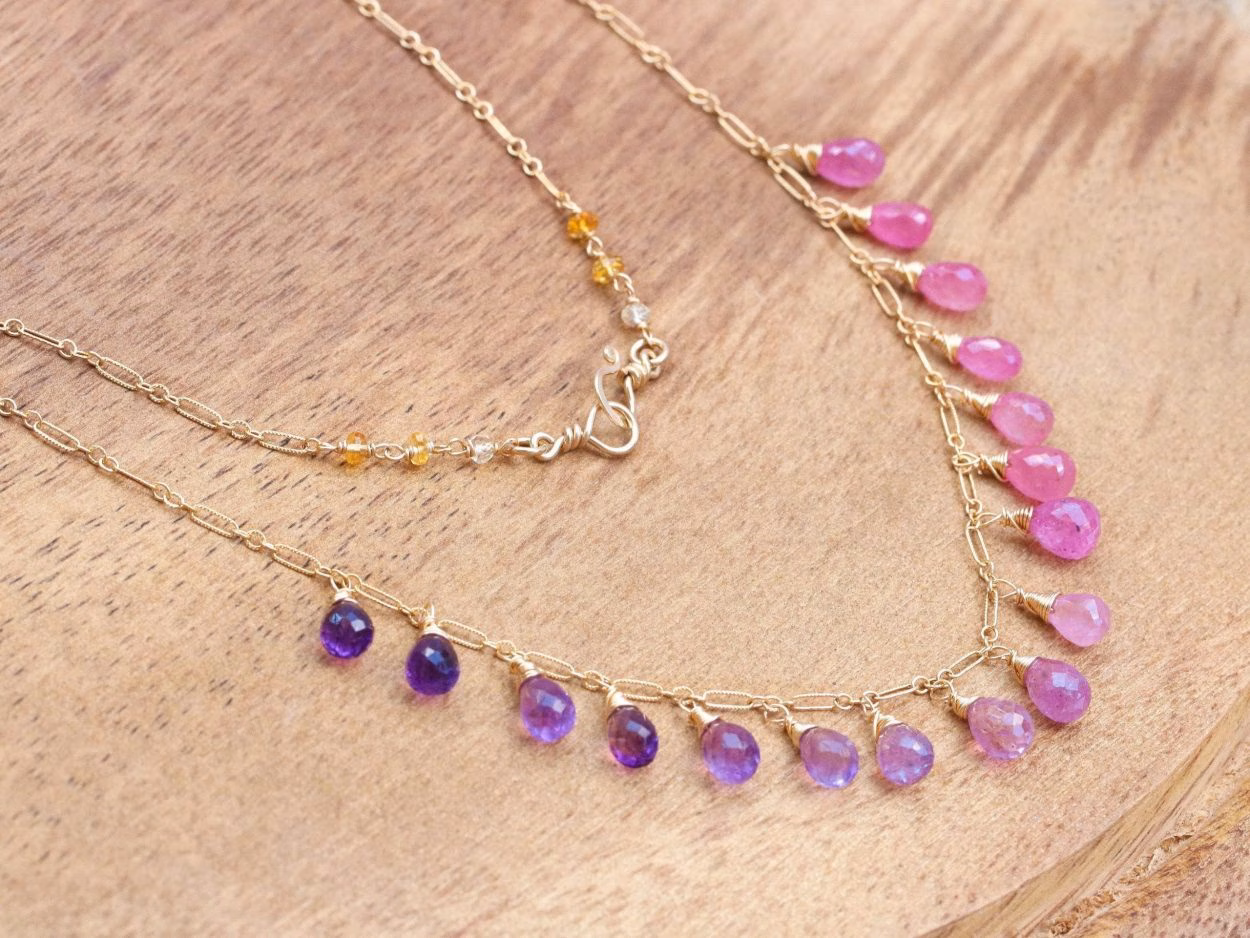 Delicious, precious gemstone drops of Pink Sapphires and Amethysts are delicately wire wrapped into the beautiful Solid Gold 14K chain.