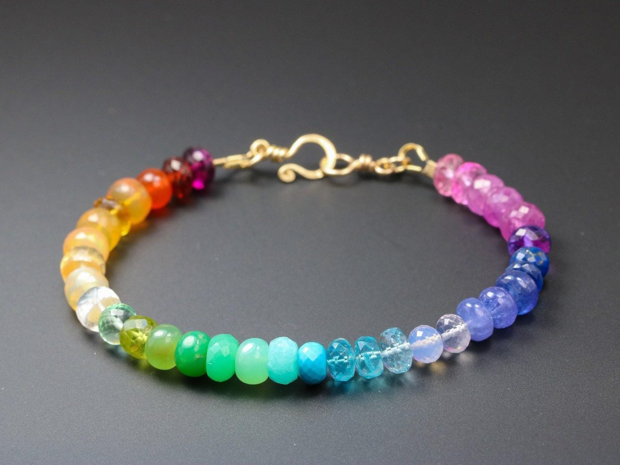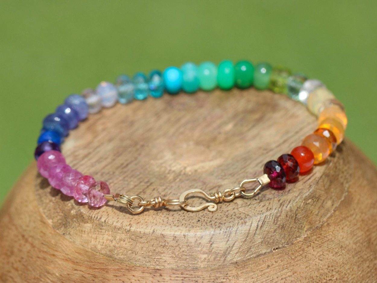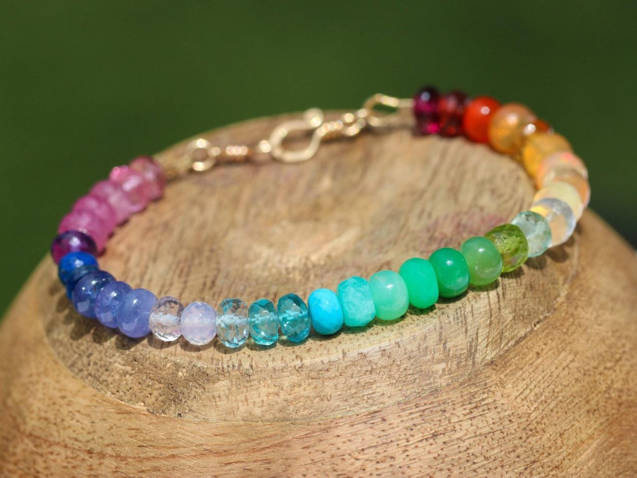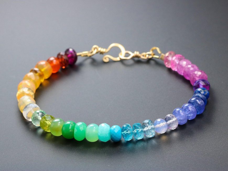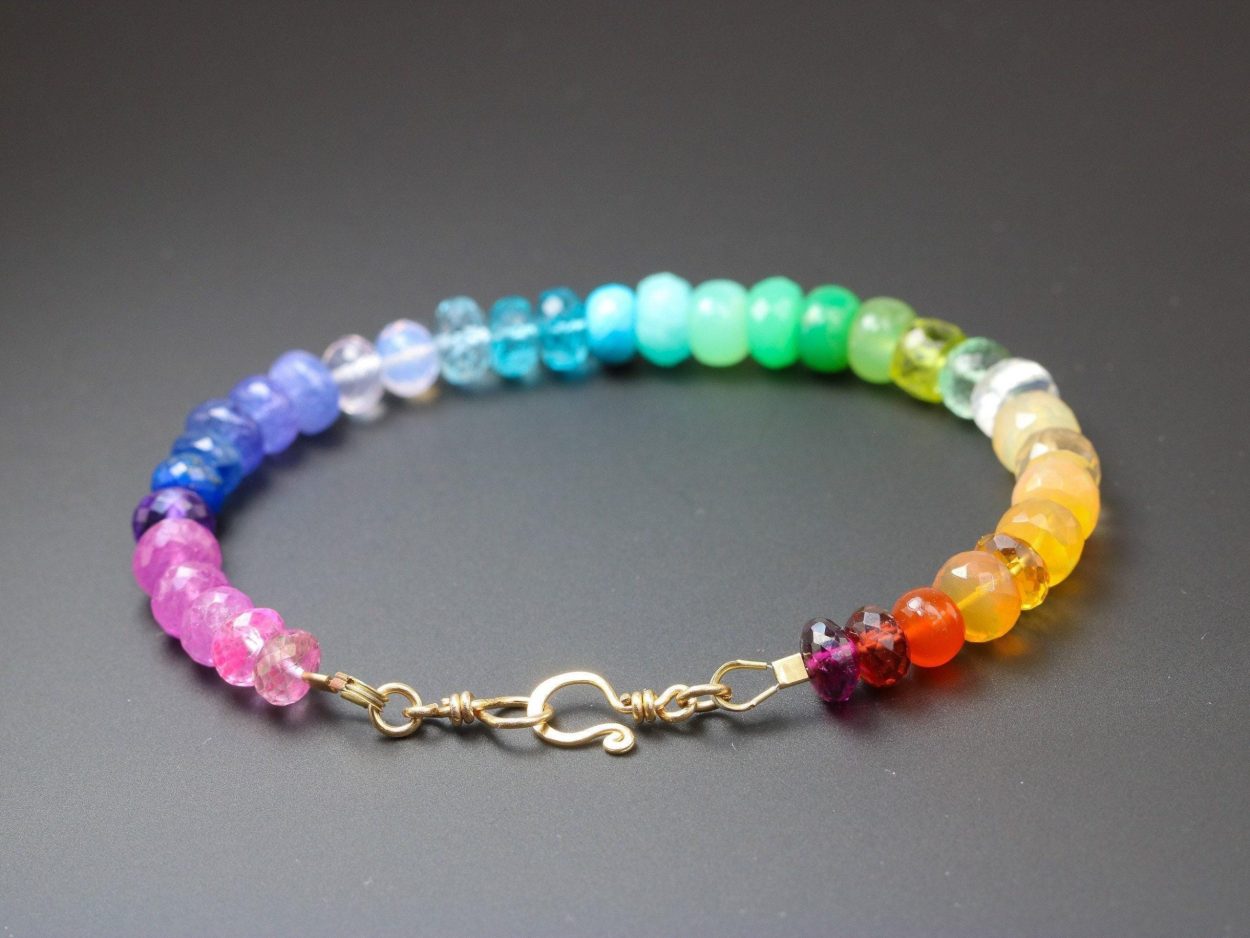 Vibrant rainbow gemstone bracelet, made in 14K Solid Gold, with gorgeous fine gemstones. Here I have gathered the most stunning, clear, sparkling AAA quality rondelles faceted and smooth. The precious rondelles I used are large and of extremely high quality – just look how each one glows and sparkles! Their size is between 6mm to 7mm, which makes this bracelet absolutely a show-stopper.