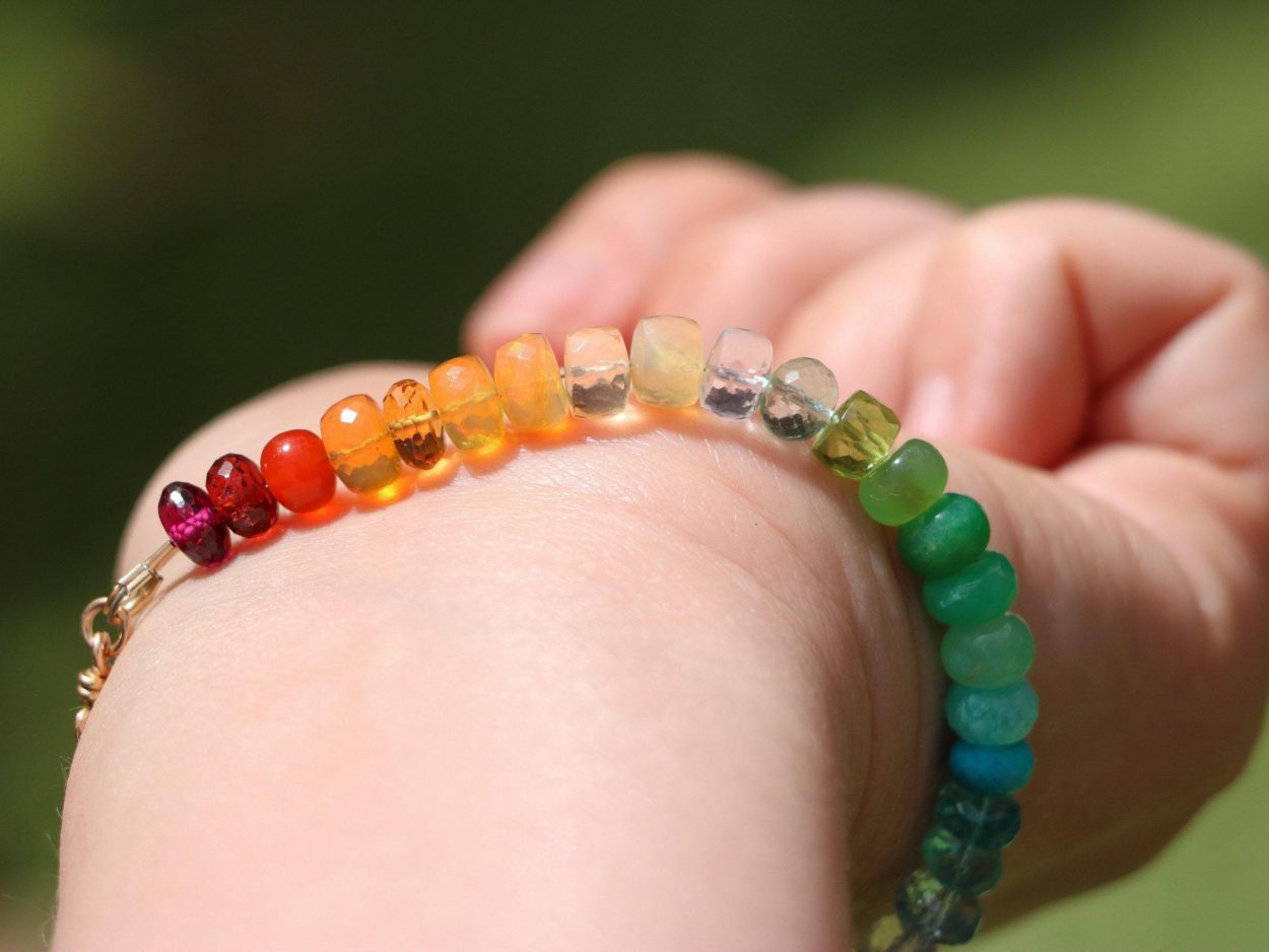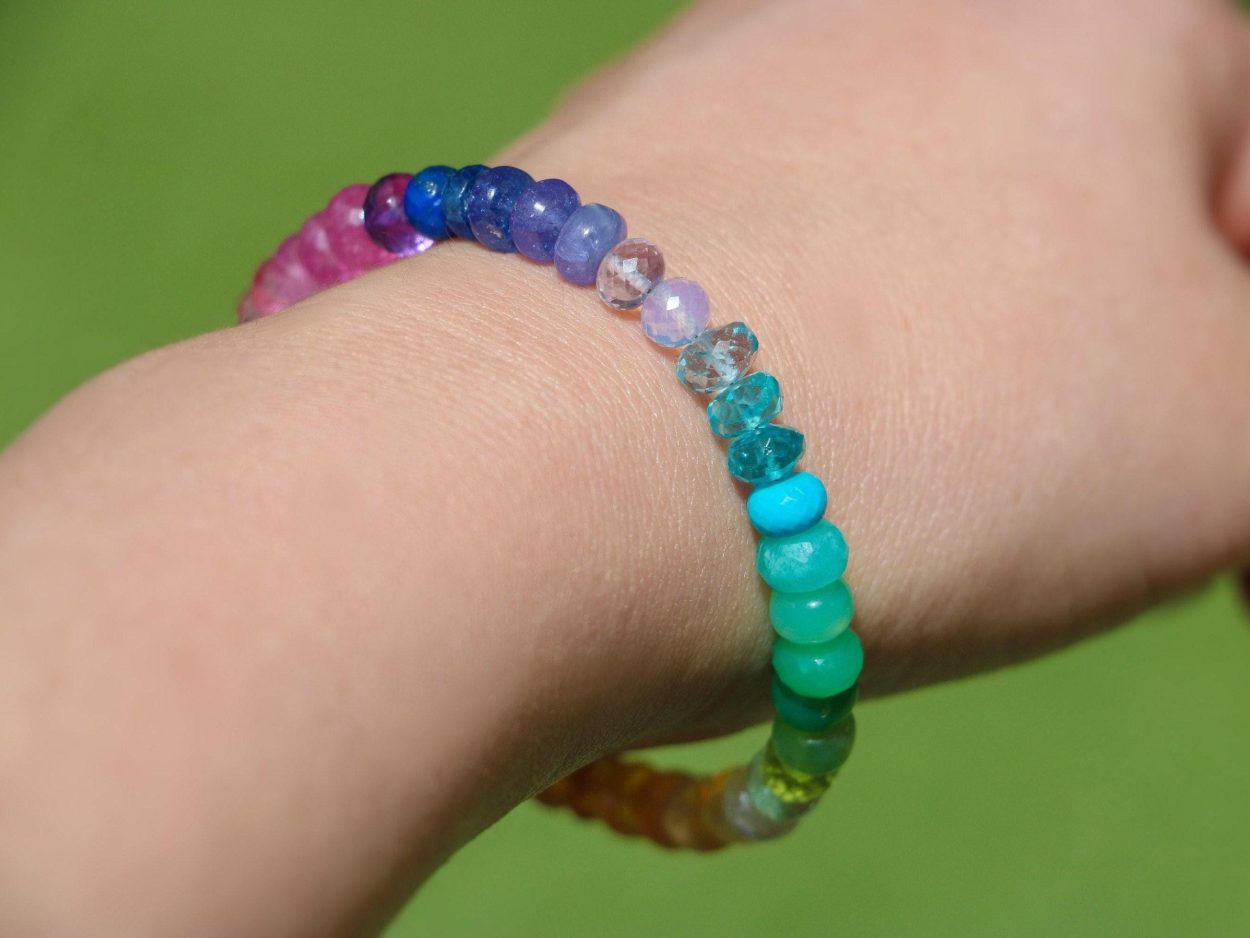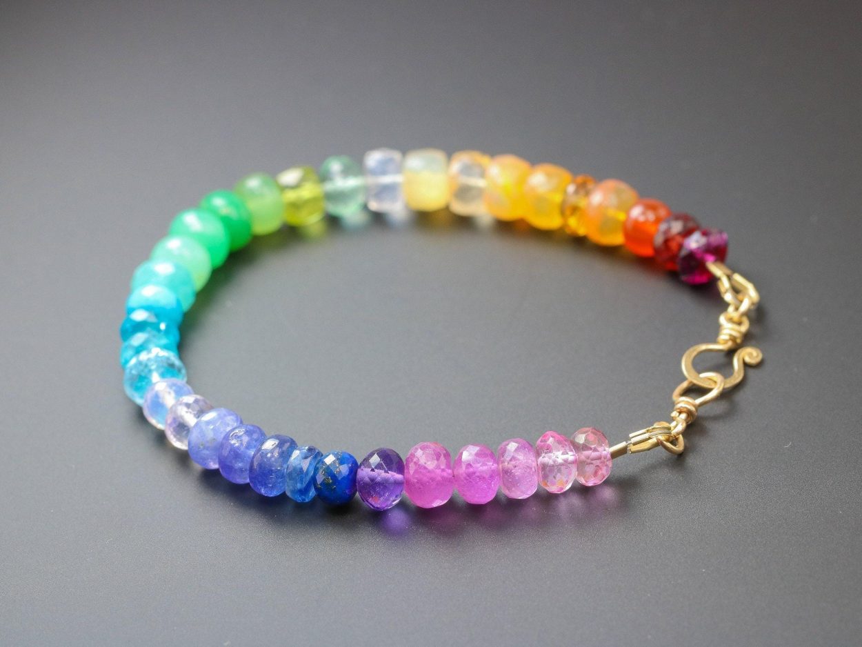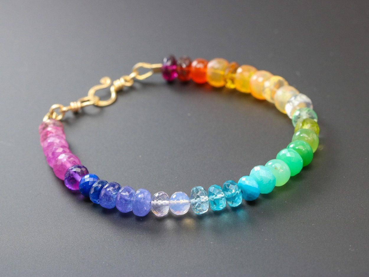Vibrant rainbow gemstone bracelet, made in 14K Solid Gold, with gorgeous fine gemstones. Here I have gathered the most stunning, clear, sparkling AAA quality rondelles faceted and smooth. The precious rondelles I used are large and of extremely high quality – just look how each one glows and sparkles! Their size is between 6mm to 7mm, which makes this bracelet absolutely a show-stopper.