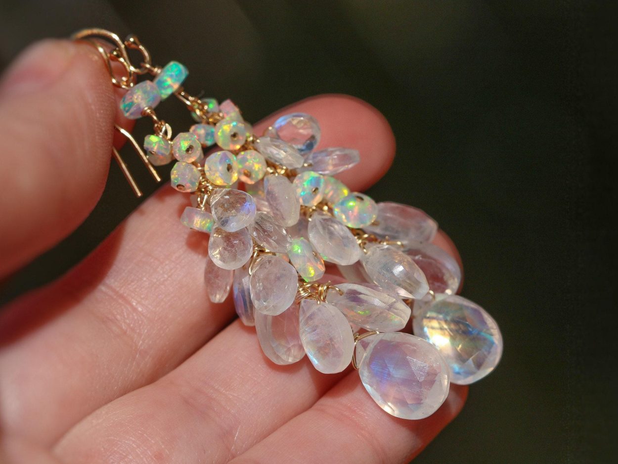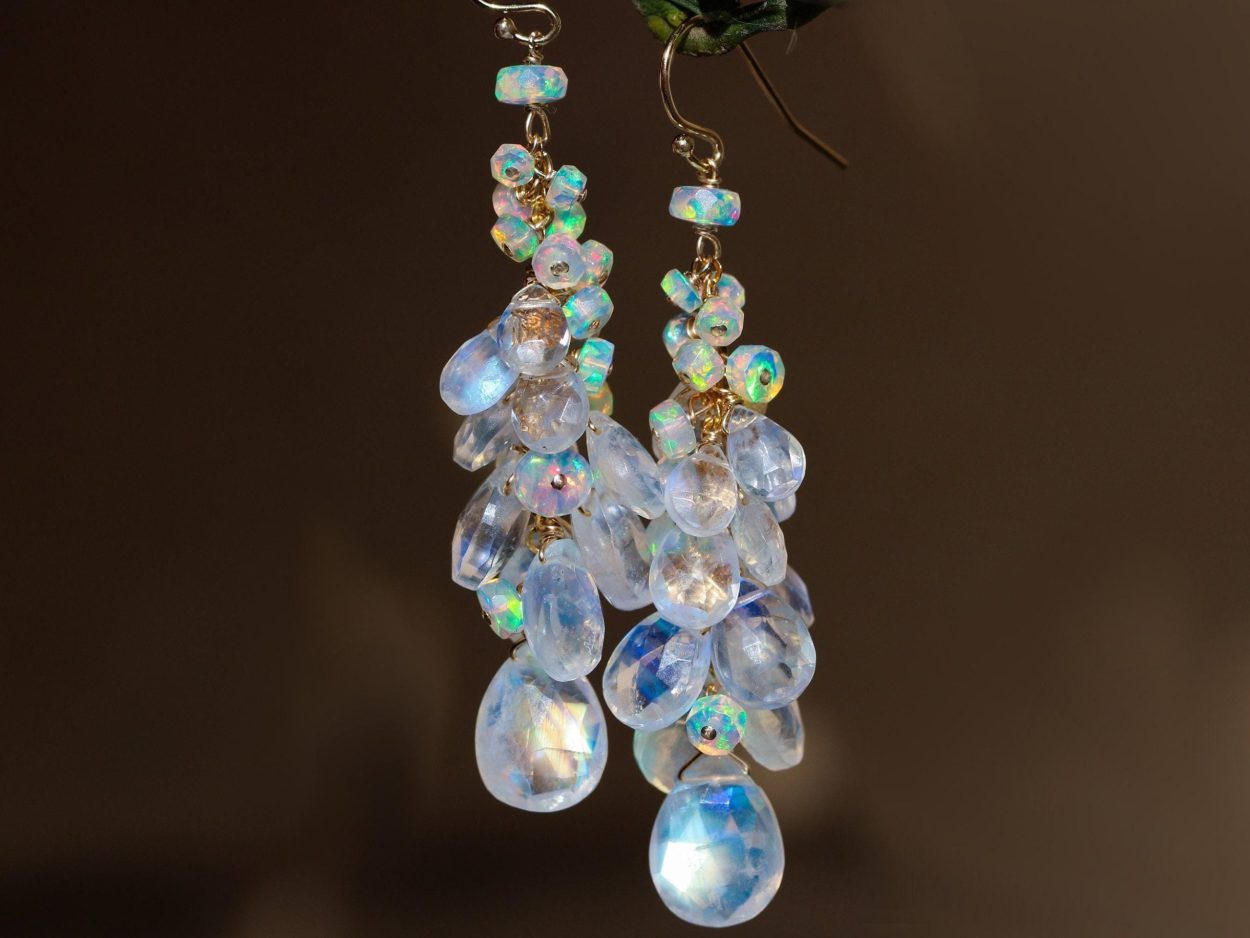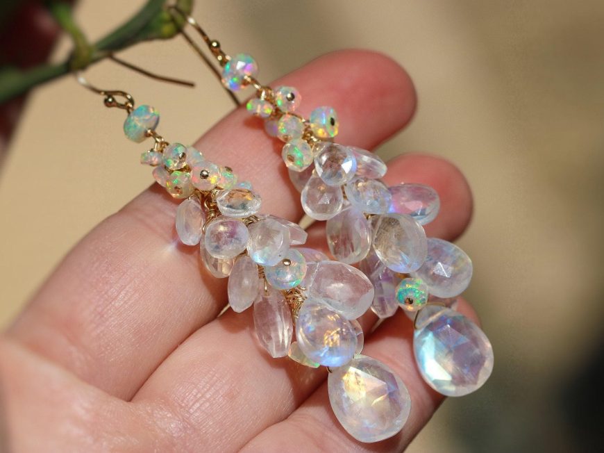 The Ethiopian Opals and Moonstones used in these earrings are of amazing very high quality, what is rare is that they’re faceted and have magnitudes of fire and light in them that was very hard to capture with the camera.