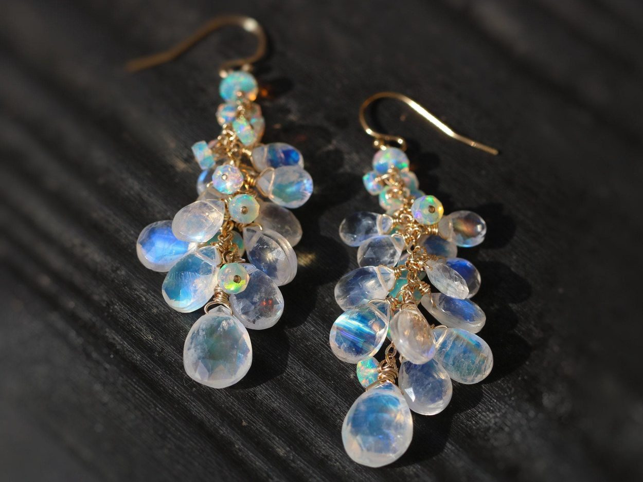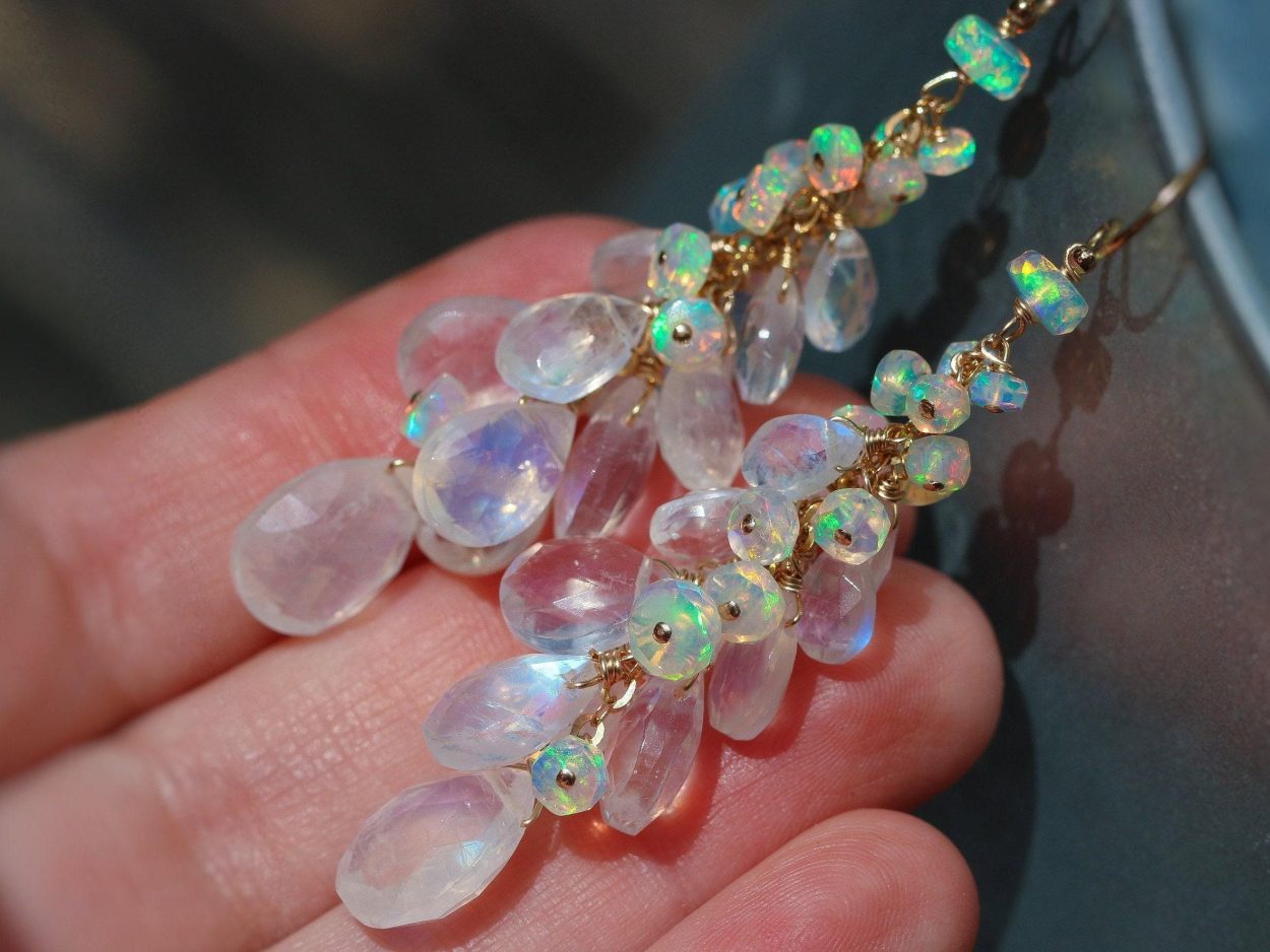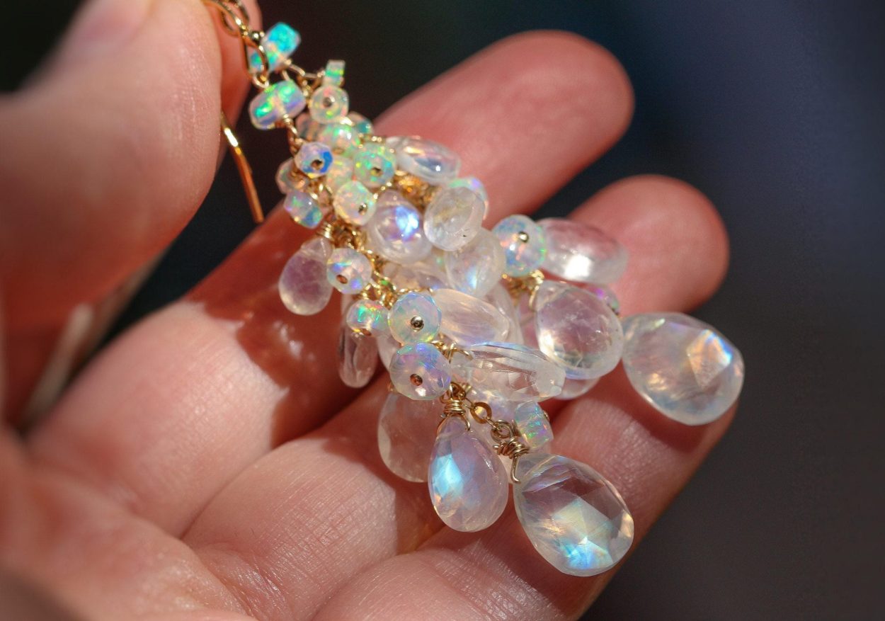 The Ethiopian Opals and Moonstones used in these earrings are of amazing very high quality, what is rare is that they’re faceted and have magnitudes of fire and light in them that was very hard to capture with the camera.