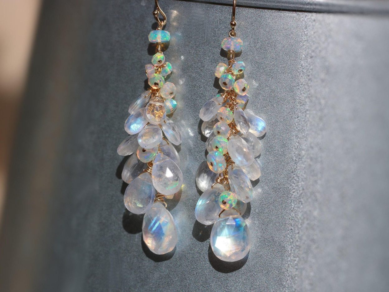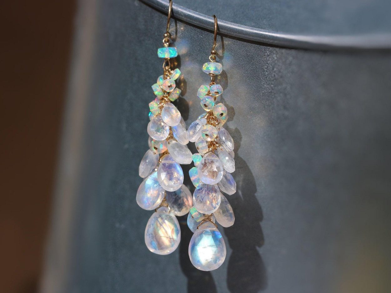 These 14K Solid Gold Moonstone and Opal earrings are an elegant mix of pastel watercolor hues and textured gemstones. They include amazing *super glowing* faceted Ethiopian Opal rondelles and Rainbow Moonstone briolettes with high flash.