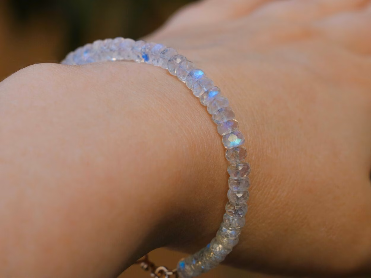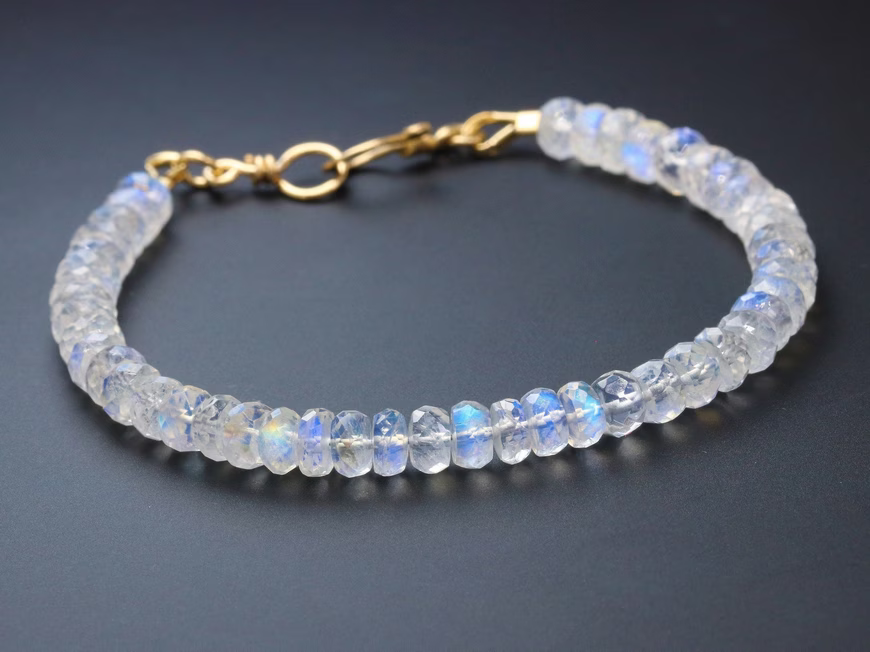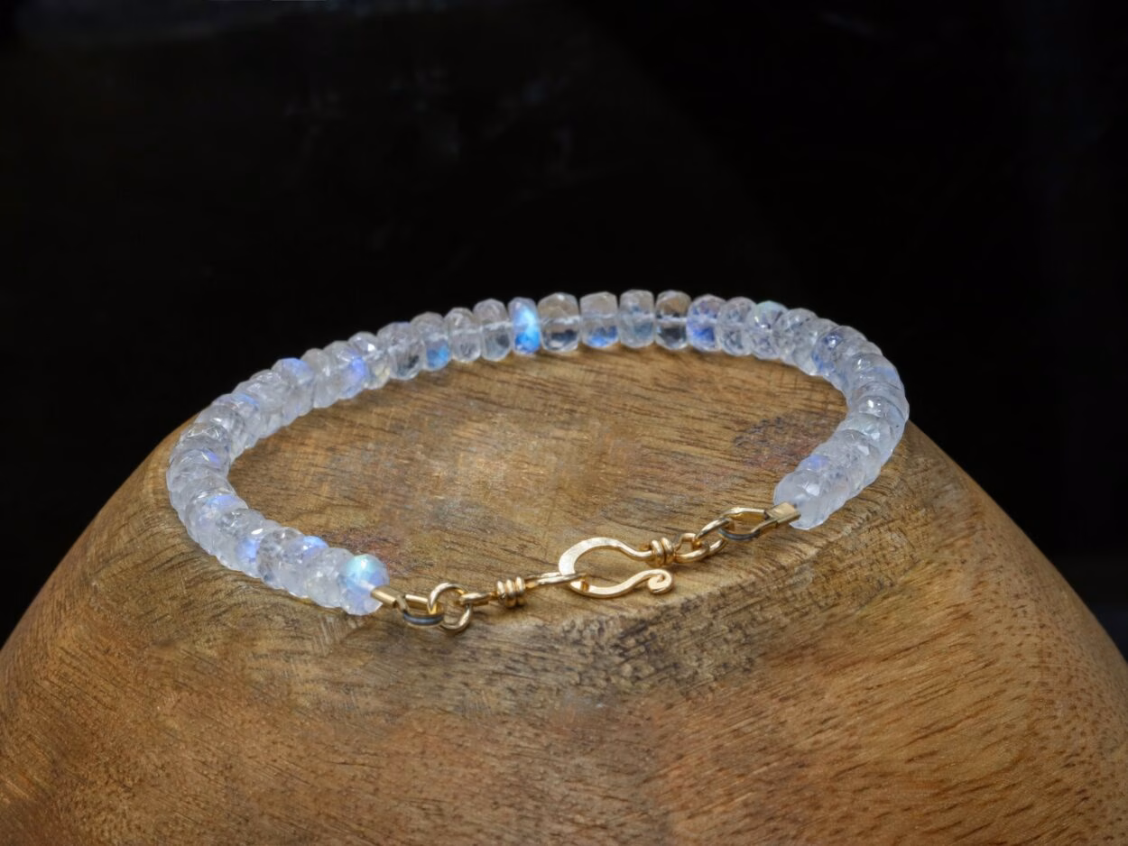 Rainbow Moonstone bracelet in 14K Solid Gold with fantastic gemstones. These precious gemstone beads are super faceted, sparkle beautifully and have amazing semi-transparent base with blue fire.