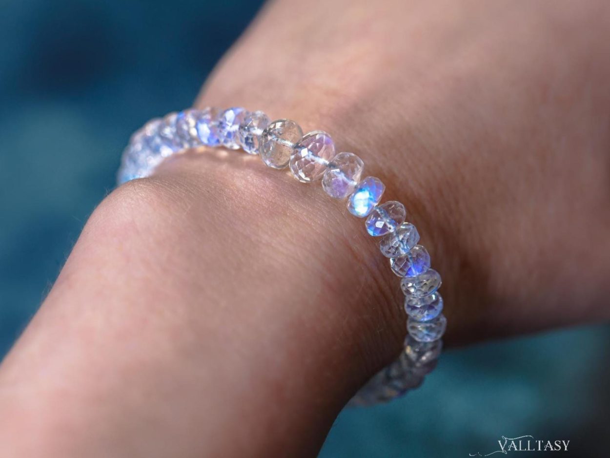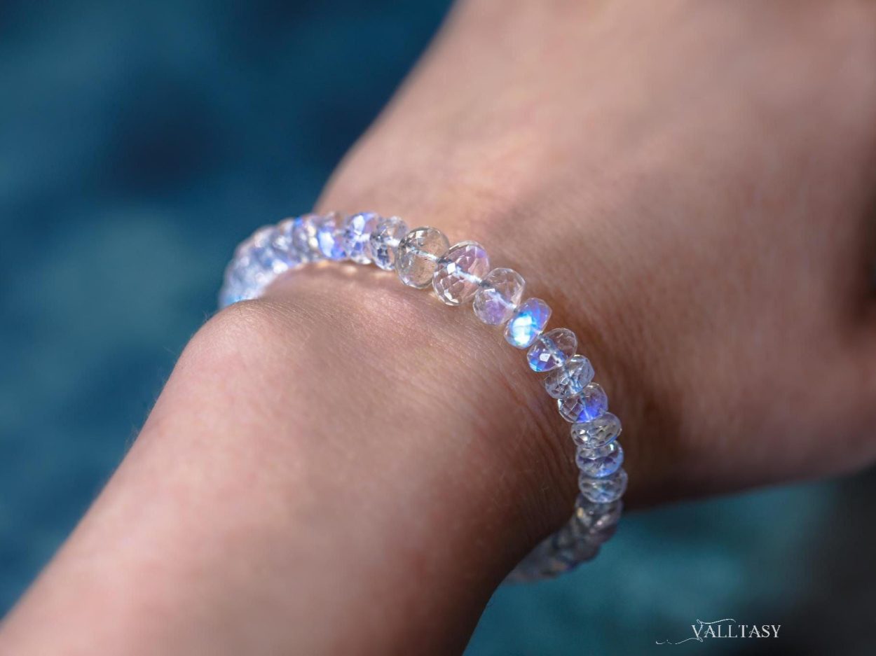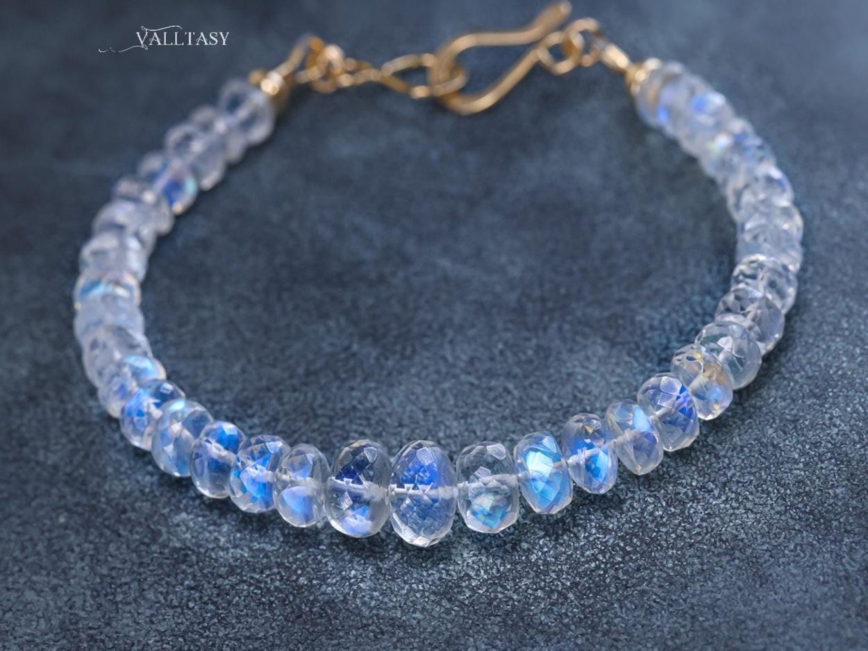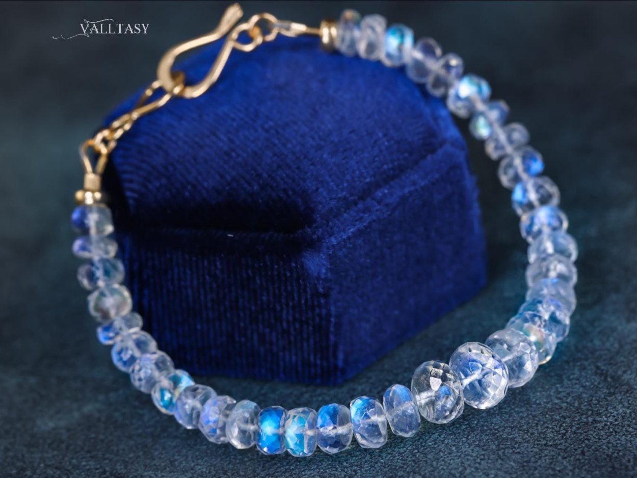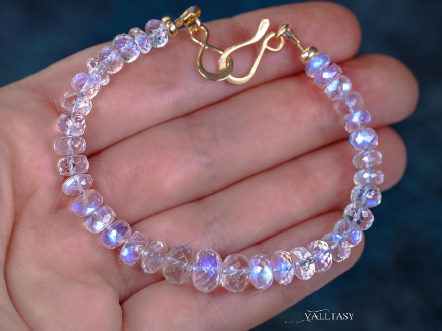 Crafted lovingly from luscious 14K solid gold and adorned with extremely large ethereal Rainbow Moonstones, this bracelet isn’t just a piece of jewelry – it’s a magical experience wrapped around your wrist. Each moonstone bead is like a tiny orb of moonlight, capturing and reflecting colors that dance like the aurora borealis against your skin.