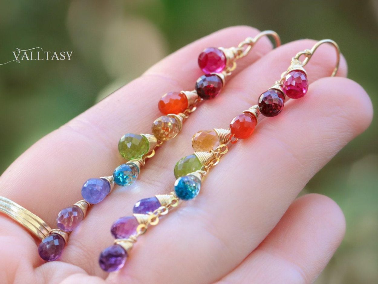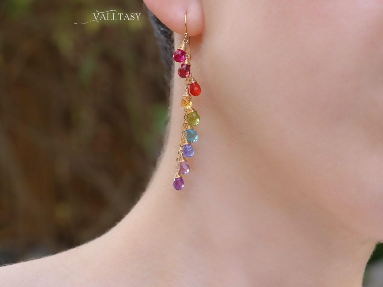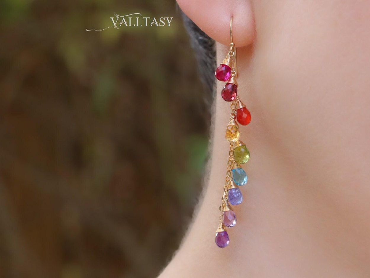 Playful long rainbow earrings full of amazing colors and perfect stones. Fully made in 14K Solid Gold.