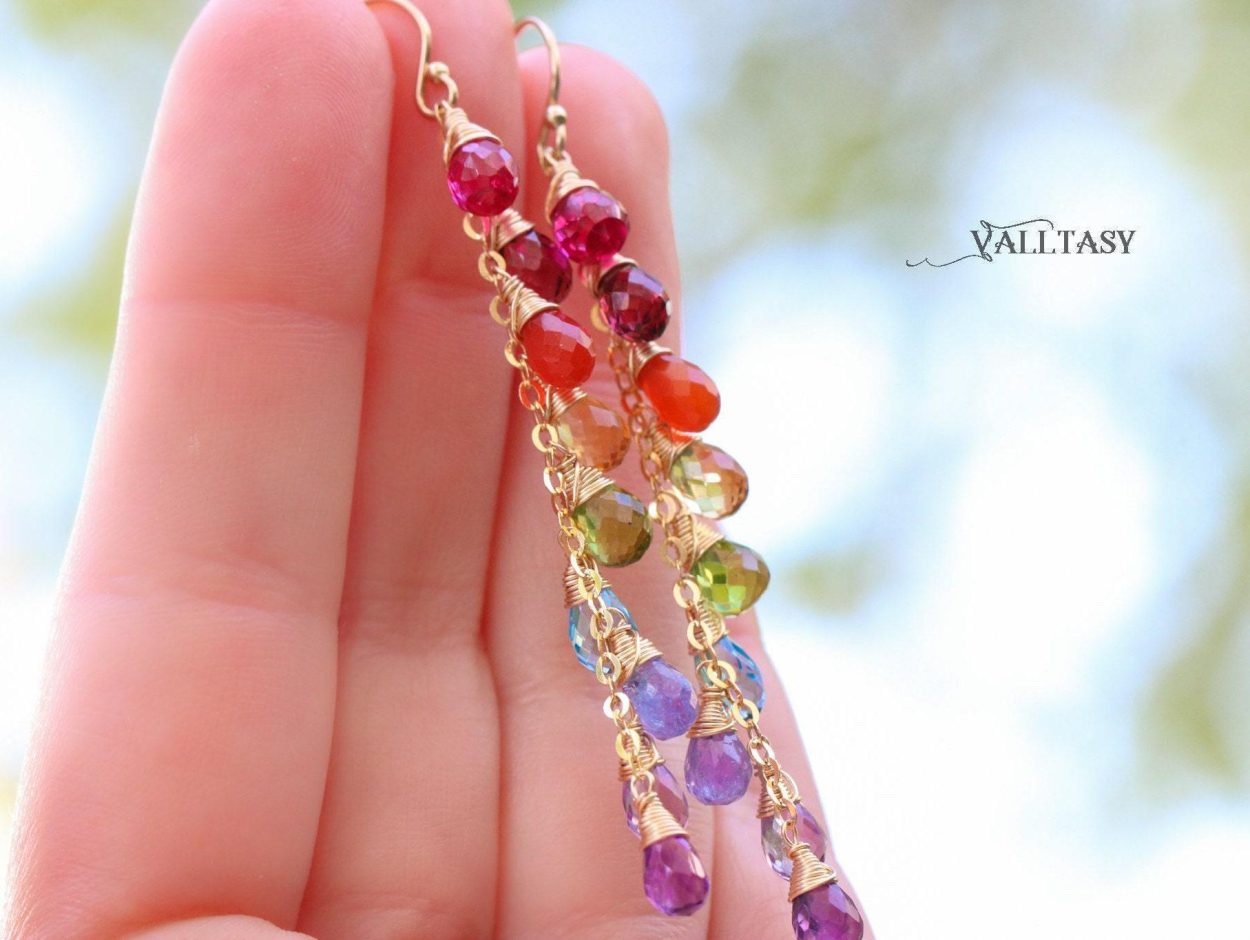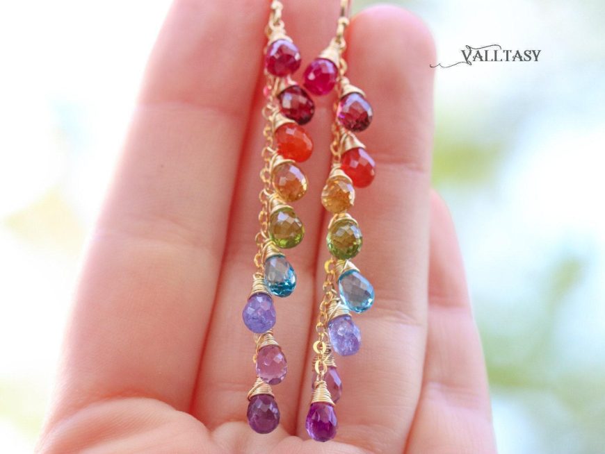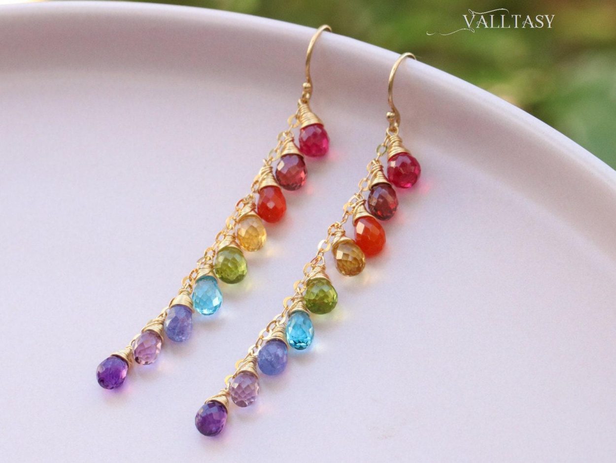 Playful long rainbow earrings full of amazing colors and perfect stones. Fully made in 14K Solid Gold.