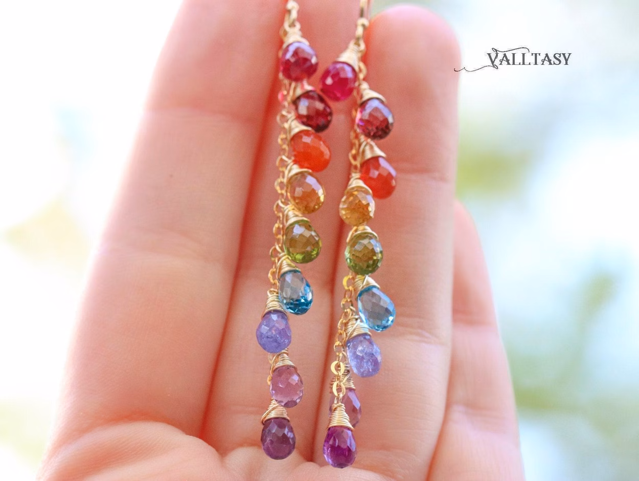 Playful long rainbow earrings full of amazing colors and perfect stones. Fully made in 14K Solid Gold.