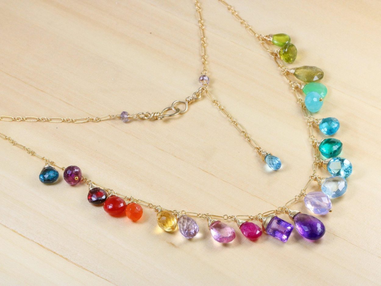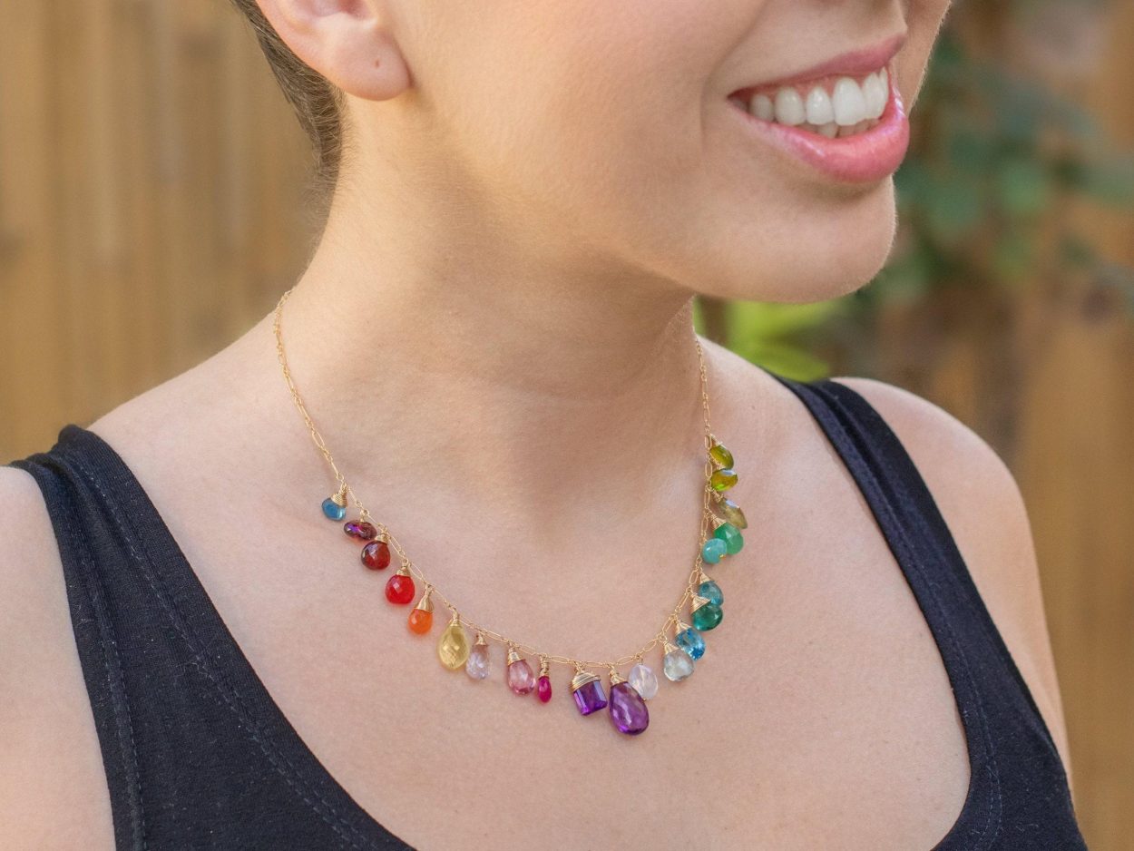 This 14K Solid Gold necklace features breathtakingly gorgeous precious gemstones in a rainbow color palette! Signature Valltasy necklace design.