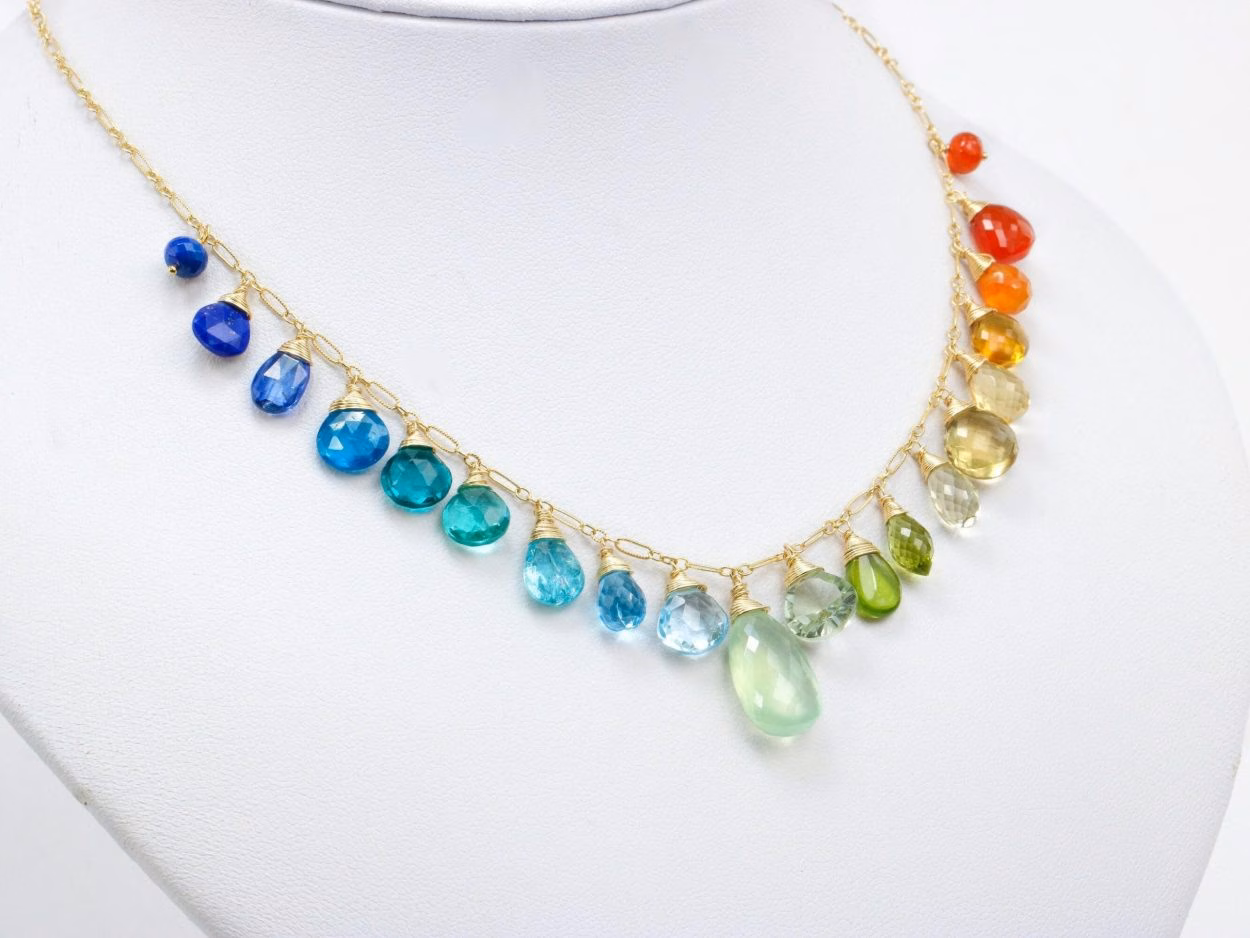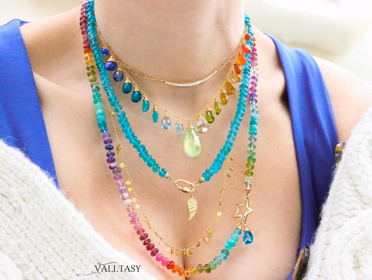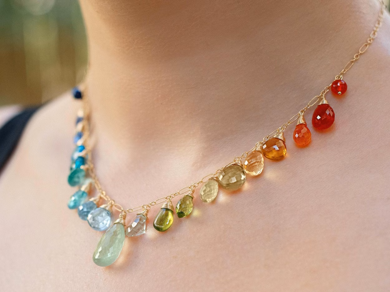 This colorful 14K Solid Gold necklace is a candy world for all gemstone jewelry lovers! This necklace features breathtakingly gorgeous precious gemstone rainbow palette with colors that will make you dance with joy! Like a flame, they sparkle, glow and bring lots of light.
