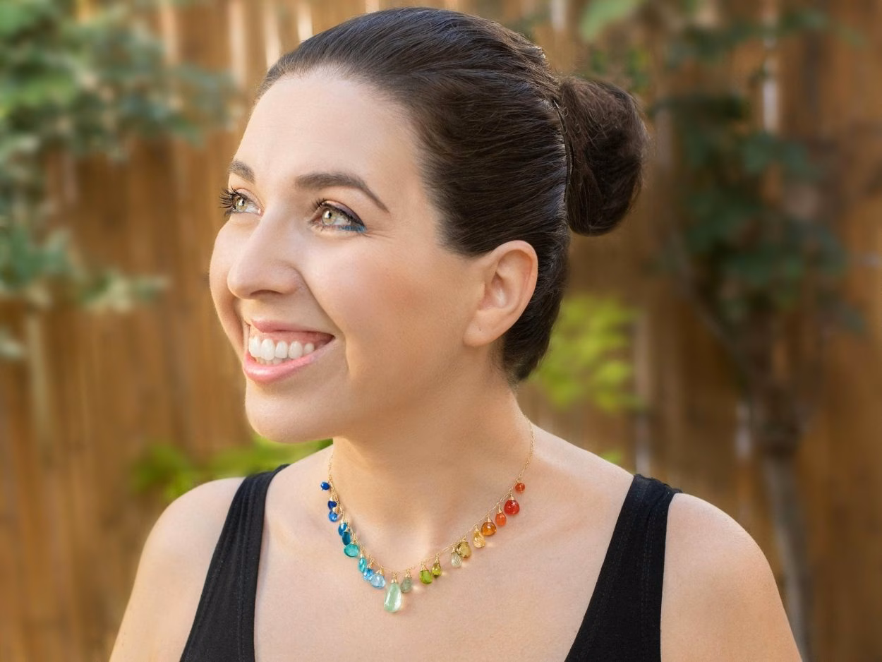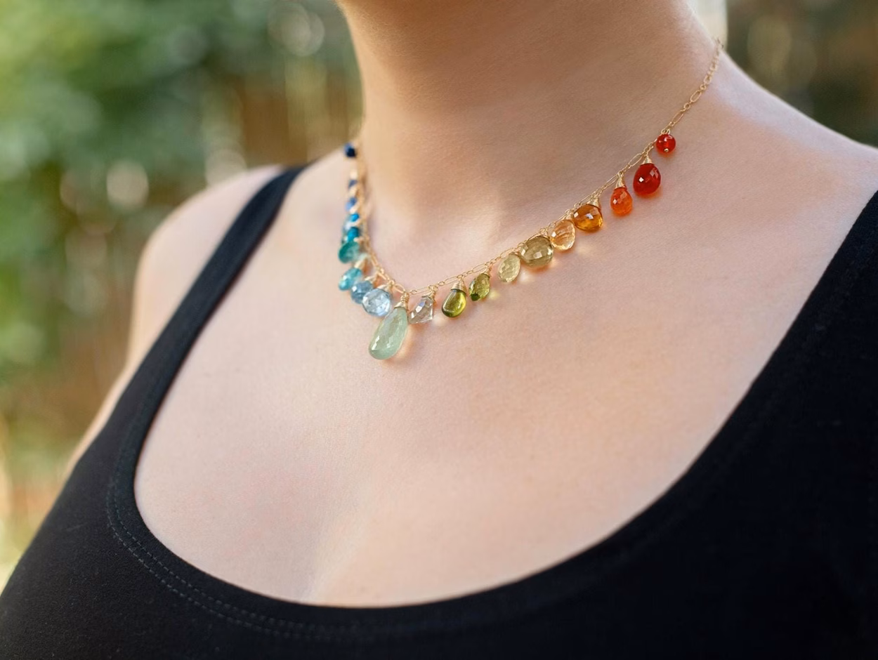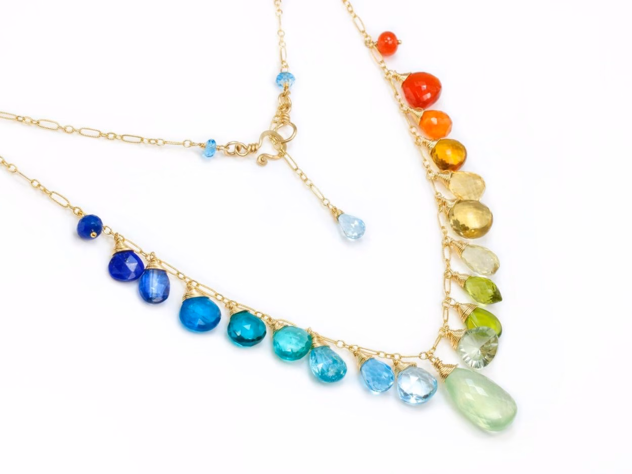 This colorful 14K Solid Gold necklace is a candy world for all gemstone jewelry lovers! This necklace features breathtakingly gorgeous precious gemstone rainbow palette with colors that will make you dance with joy! Like a flame, they sparkle, glow and bring lots of light.
