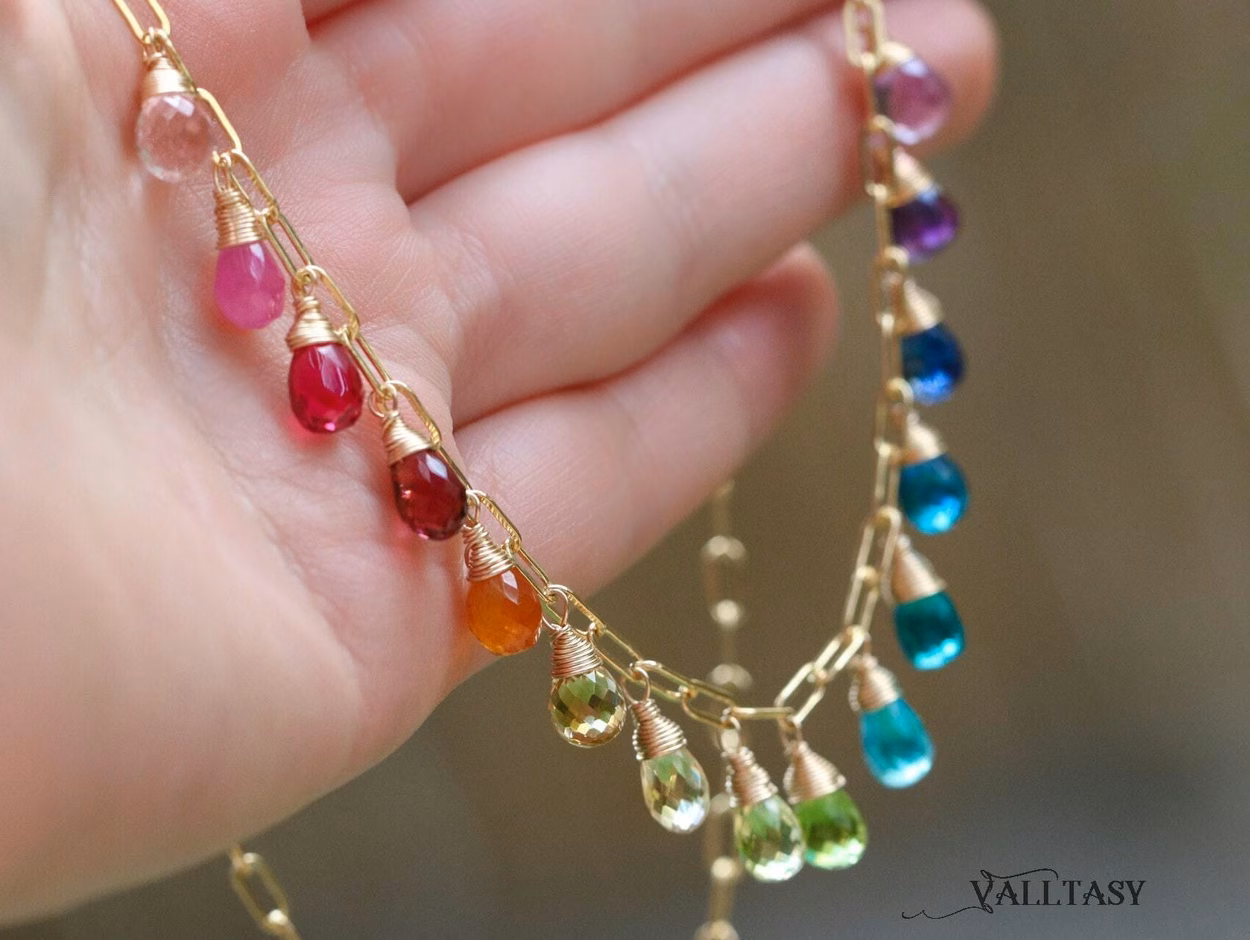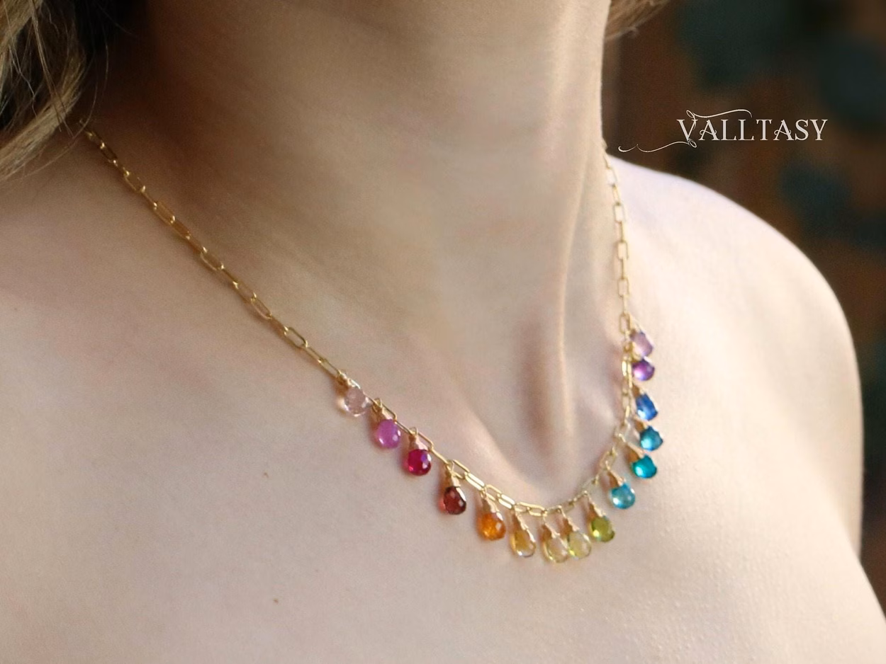 This 14K Solid Gold necklace features breathtakingly gorgeous gemstone drops in a vibrant rainbow arrangement.