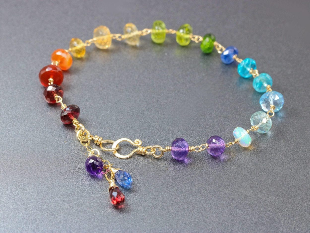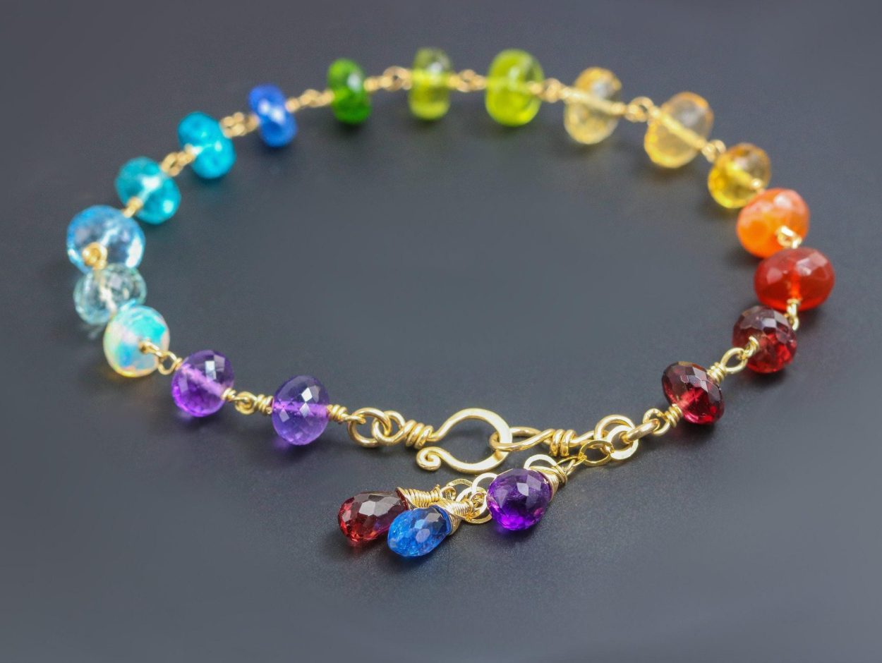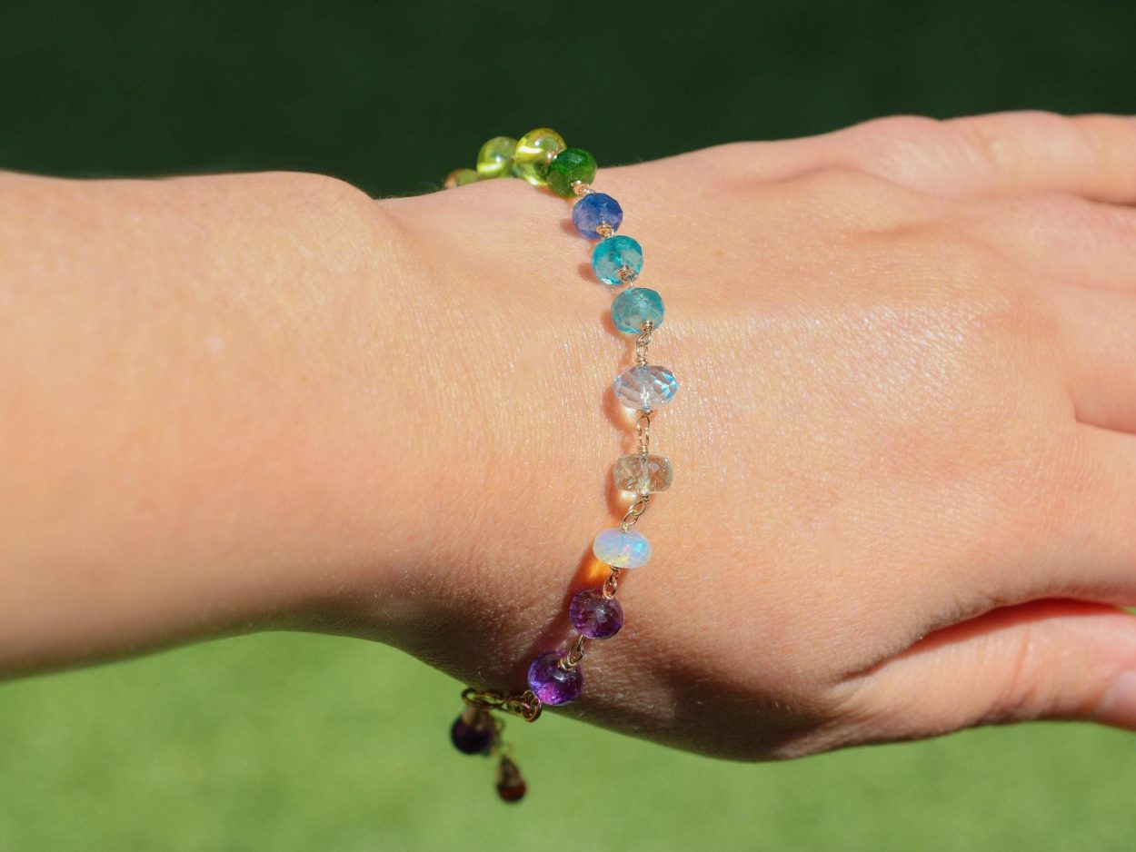This 14K Solid Gold bracelet features breathtakingly gorgeous precious gemstones in a rainbow color palette.