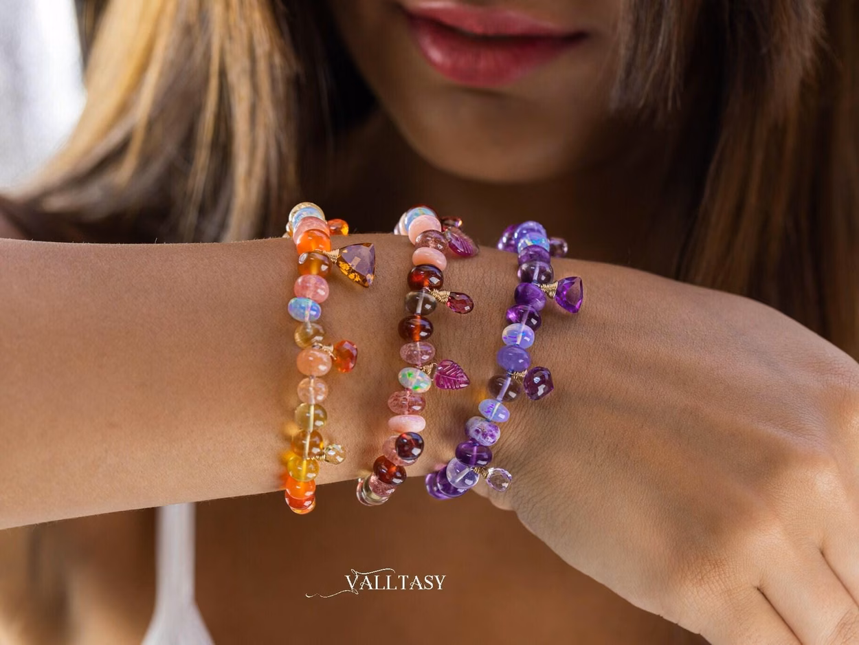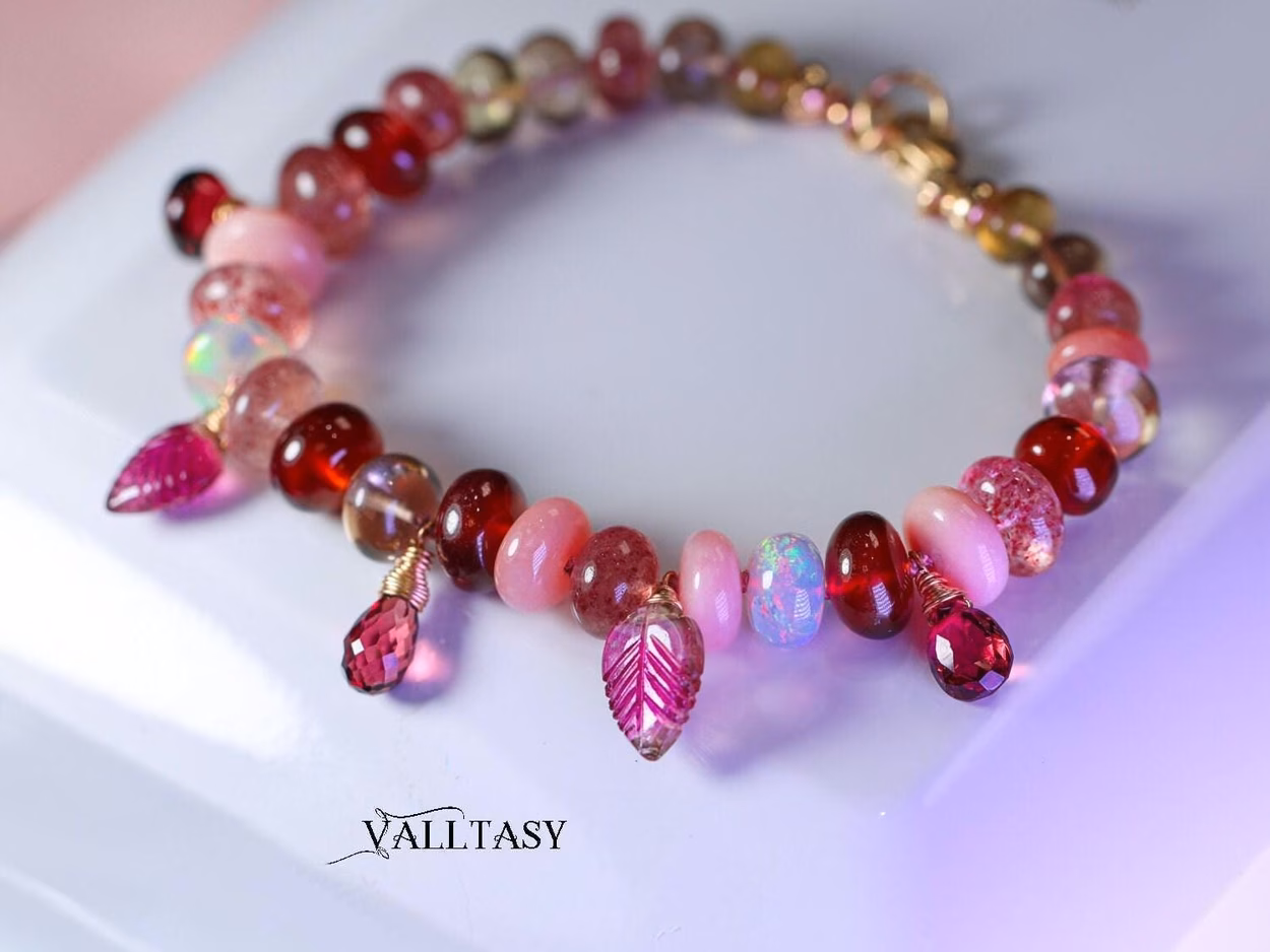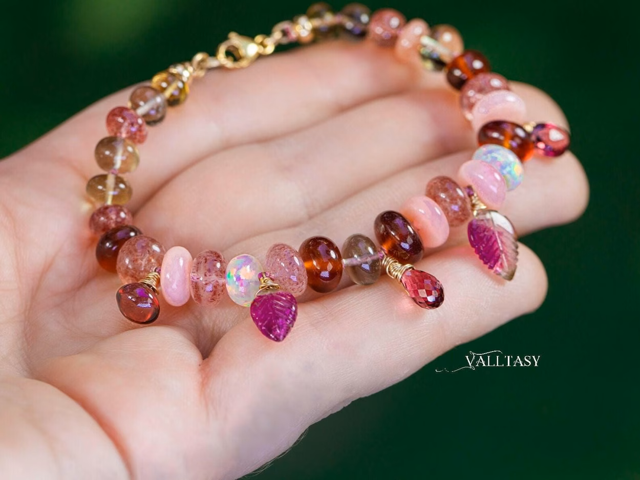 The “Spicy Latte” Bracelet is a dazzling 14K solid gold masterpiece adorned with opulent Opals, Tourmalines, Garnets and vibrant peach, cocoa and pink gemstones.