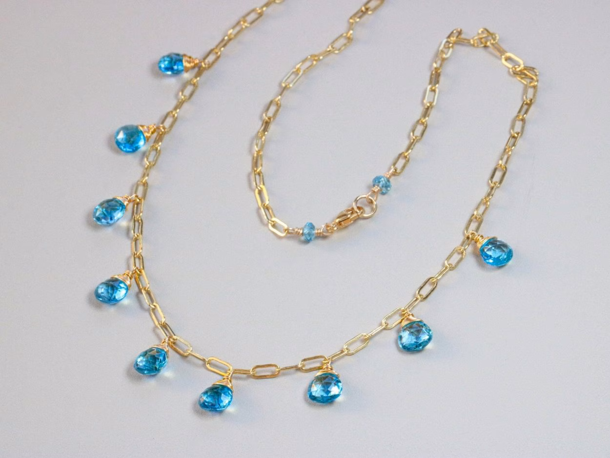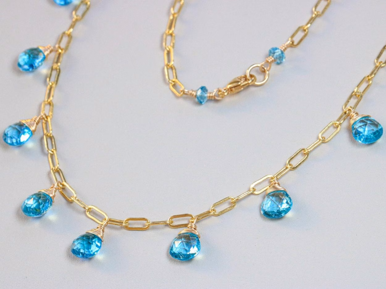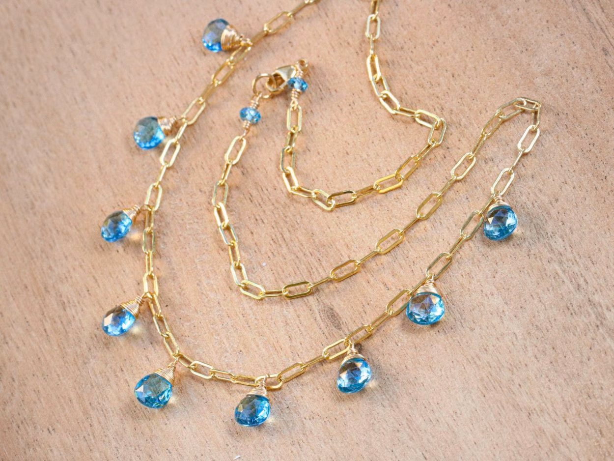 This 14K Solid Gold gemstone station necklace features breathtakingly gorgeous natural Swiss Blue Topaz.