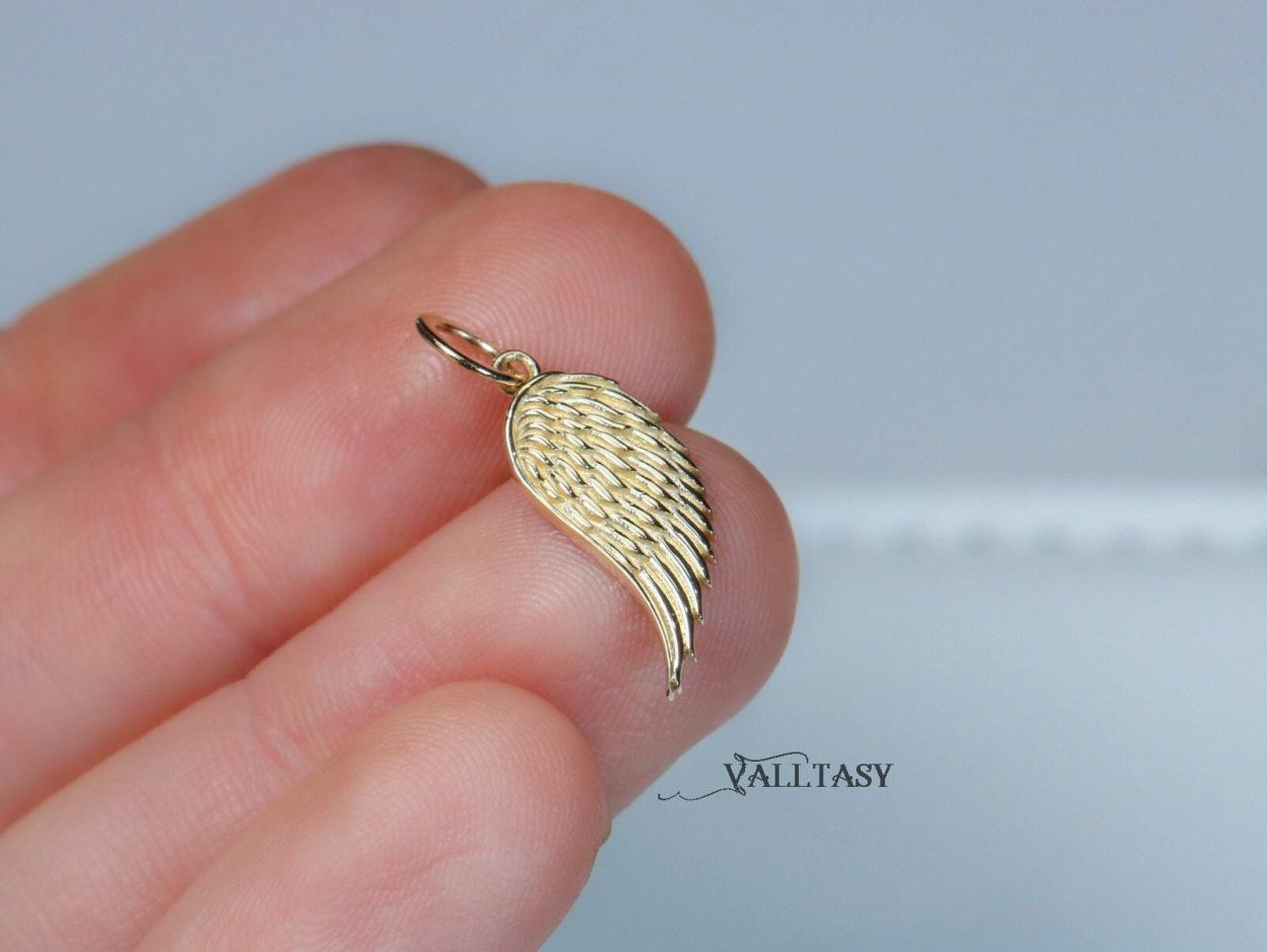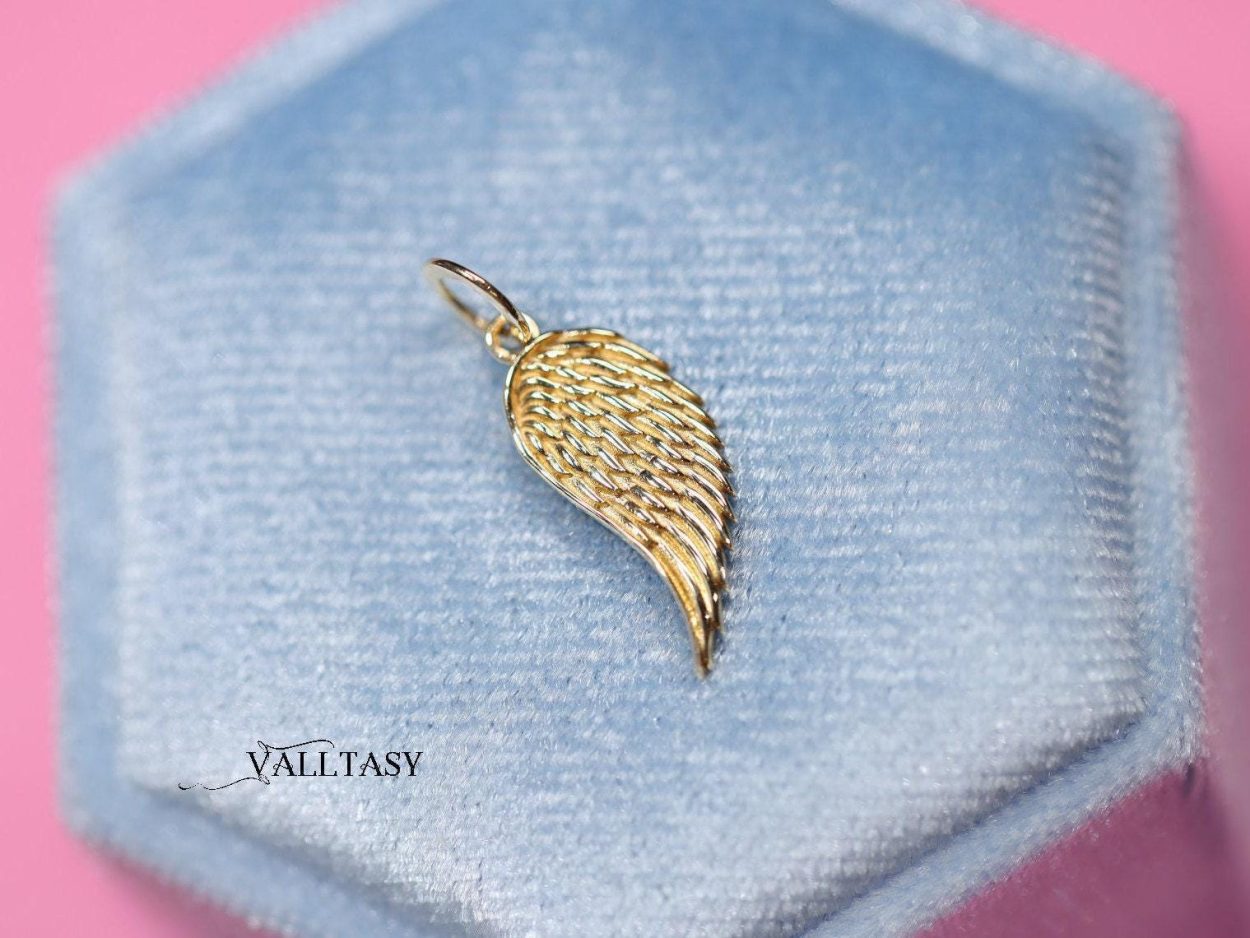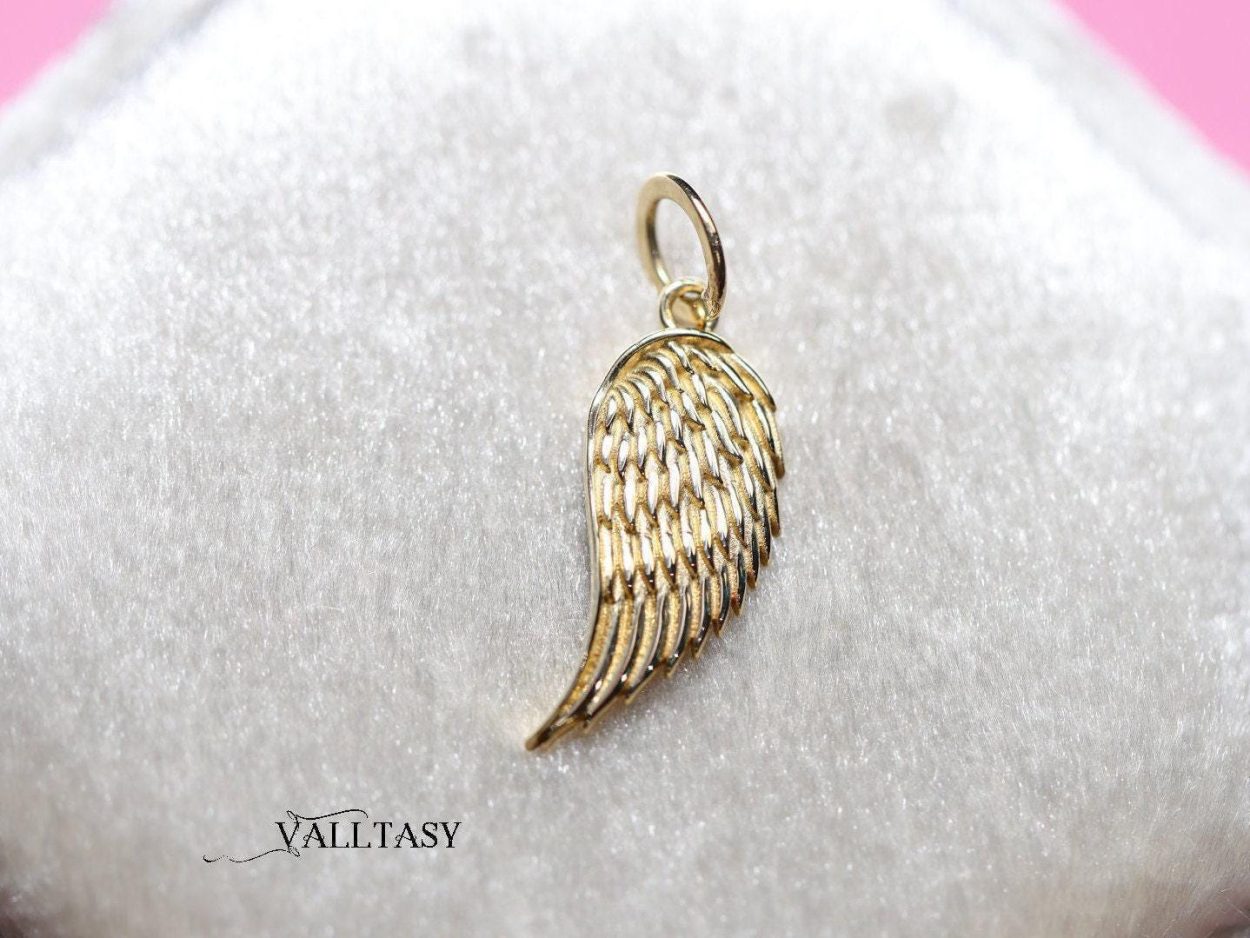 Enchanting Wing Charm in 14K Solid Gold. This charm is very textured and detailed, perfectly shaped to adorn your necklace layering.