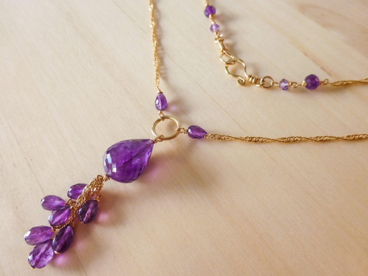 This amazing necklace includes faceted Purple Amethyst briolette as a centerpiece and a large section of small Amethyst briolettes which I have connected to delicate chains as a tassel.