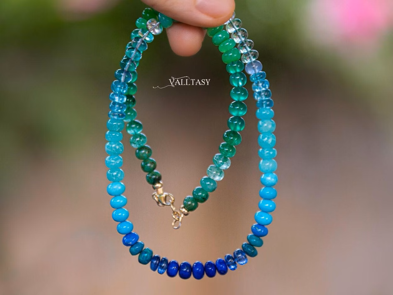Crafted with meticulous attention to details in colors, this necklace features an enchanting array of gemstones in vibrant blues and greens, set in lustrous 14K Solid Gold.